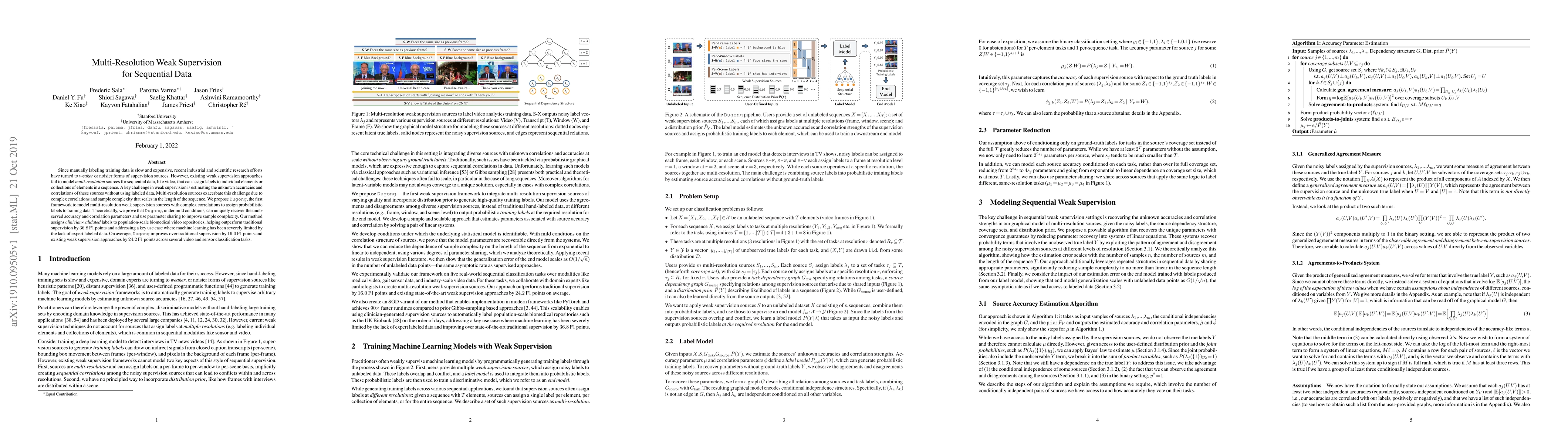 Since manually labeling training data is slow and expensive, recent industrial and scientific research efforts have turned to weaker or noisier forms of supervision sources. However, existing weak supervision approaches fail to model multi-resolution sources for sequential data, like video, that can assign labels to individual elements or collections of elements in a sequence. A key challenge in weak supervision is estimating the unknown accuracies and correlations of these sources without using labeled data. Multi-resolution sources exacerbate this challenge due to complex correlations and sample complexity that scales in the length of the sequence. We propose Dugong, the first framework to model multi-resolution weak supervision sources with complex correlations to assign probabilistic labels to training data. Theoretically, we prove that Dugong, under mild conditions, can uniquely recover the unobserved accuracy and correlation parameters and use parameter sharing to improve sample complexity. Our method assigns clinician-validated labels to population-scale biomedical video repositories, helping outperform traditional supervision by 36.8 F1 points and addressing a key use case where machine learning has been severely limited by the lack of expert labeled data. On average, Dugong improves over traditional supervision by 16.0 F1 points and existing weak supervision approaches by 24.2 F1 points across several video and sensor classification tasks.