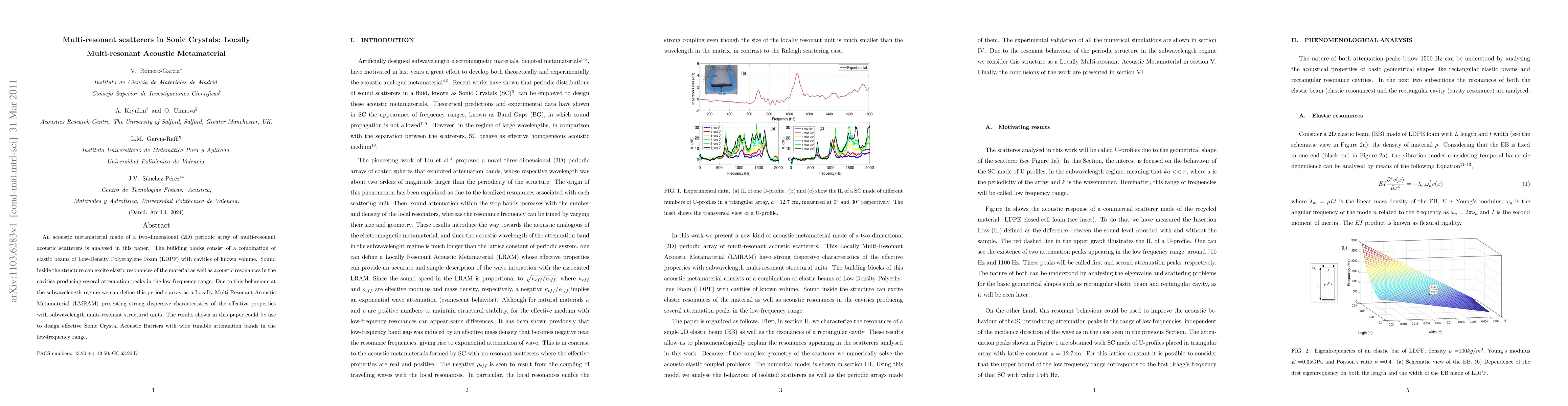 An acoustic metamaterial made of a two-dimensional (2D) periodic array of multi-resonant acoustic scatterers is analysed in this paper. The building blocks consist of a combination of elastic beams of Low-Density Polyethylene Foam (LDPF) with cavities of known volume. Sound inside the structure can excite elastic resonances of the material as well as acoustic resonances in the cavities producing several attenuation peaks in the low-frequency range. Due to this behaviour at the subwavelength regime we can define this periodic array as a Locally Multi-Resonant Acoustic Metamaterial (LMRAM) presenting strong dispersive characteristics of the effective properties with subwavelength multi-resonant structural units. The results shown in this paper could be use to design effective Sonic Crystal Acoustic Barriers with wide tunable attenuation bands in the low-frequency range.
