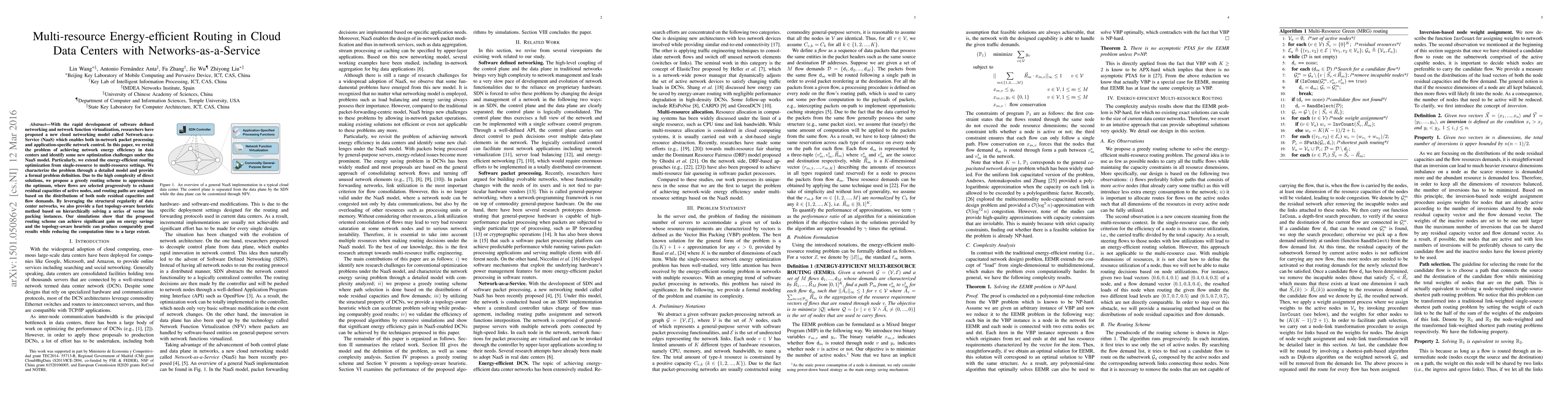 This paper proposes a multi-resource energy-efficient routing scheme for cloud data centers under the Network-as-a-Service (NaaS) model, addressing optimization challenges and leveraging structural regularity. The authors introduce a greedy routing scheme and a topology-aware heuristic method, demonstrating significant energy savings with reduced computational overhead.
