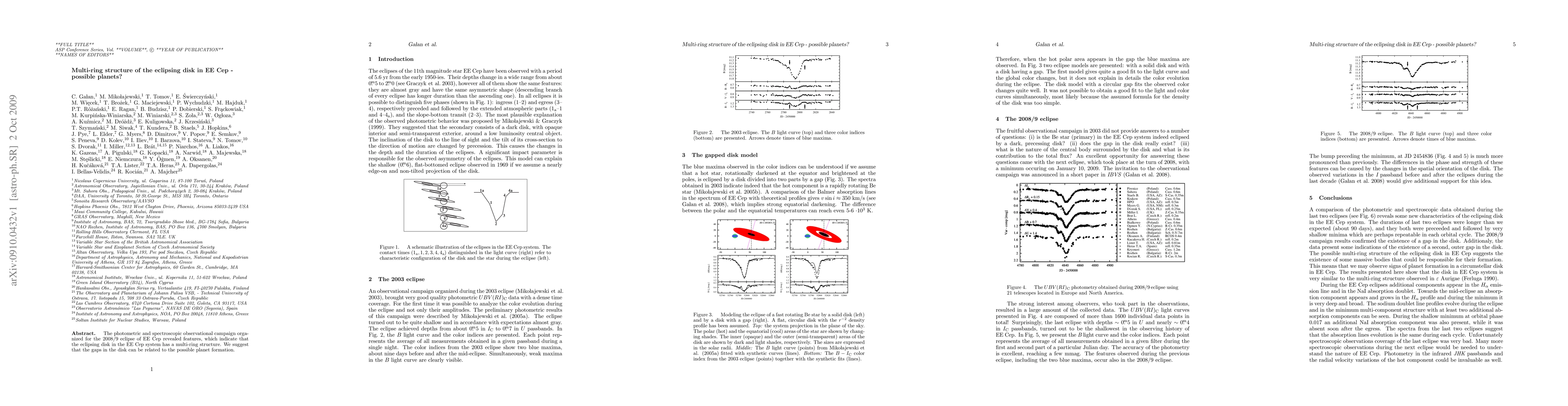 The photometric and spectroscopic observational campaign organized for the 2008/9 eclipse of EE Cep revealed features, which indicate that the eclipsing disk in the EE Cep system has a multi-ring structure. We suggest that the gaps in the disk can be related to the possible planet formation.