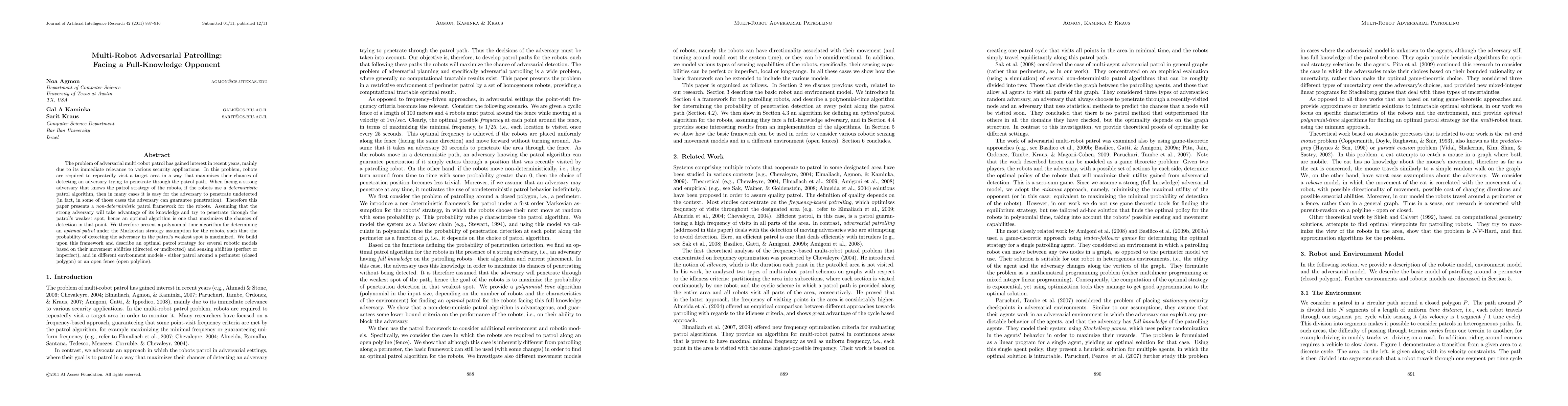 The problem of adversarial multi-robot patrol has gained interest in recent years, mainly due to its immediate relevance to various security applications. In this problem, robots are required to repeatedly visit a target area in a way that maximizes their chances of detecting an adversary trying to penetrate through the patrol path. When facing a strong adversary that knows the patrol strategy of the robots, if the robots use a deterministic patrol algorithm, then in many cases it is easy for the adversary to penetrate undetected (in fact, in some of those cases the adversary can guarantee penetration). Therefore this paper presents a non-deterministic patrol framework for the robots. Assuming that the strong adversary will take advantage of its knowledge and try to penetrate through the patrols weakest spot, hence an optimal algorithm is one that maximizes the chances of detection in that point. We therefore present a polynomial-time algorithm for determining an optimal patrol under the Markovian strategy assumption for the robots, such that the probability of detecting the adversary in the patrols weakest spot is maximized. We build upon this framework and describe an optimal patrol strategy for several robotic models based on their movement abilities (directed or undirected) and sensing abilities (perfect or imperfect), and in different environment models - either patrol around a perimeter (closed polygon) or an open fence (open polyline).