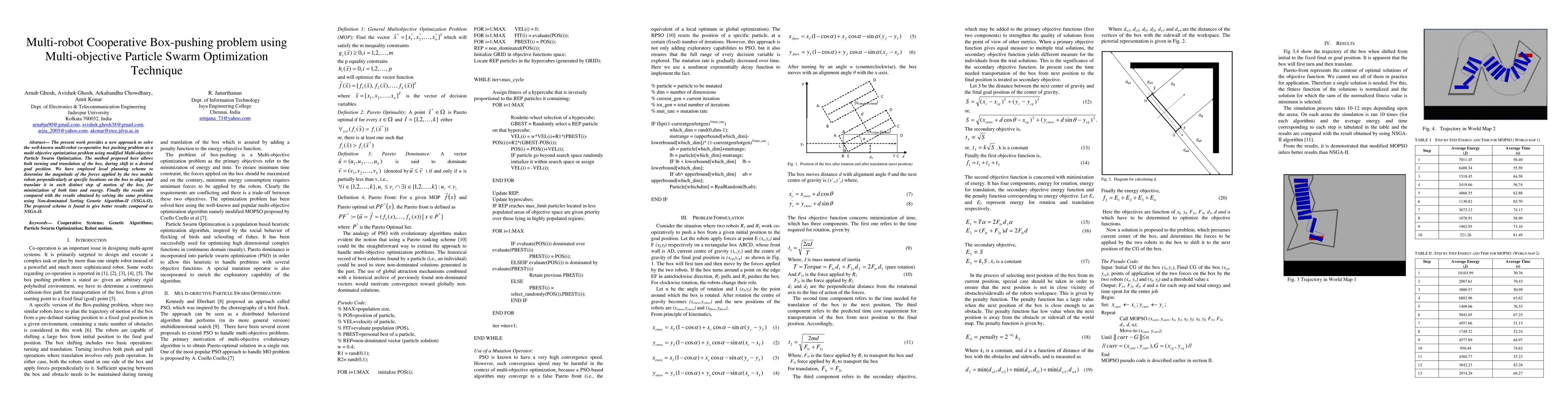 This paper introduces a novel approach to solve the multi-robot cooperative box-pushing problem using a modified Multi-objective Particle Swarm Optimization technique, achieving better results in terms of time and energy efficiency compared to NSGA-II. The method employs local planning to determine optimal forces applied by robots to move the box.