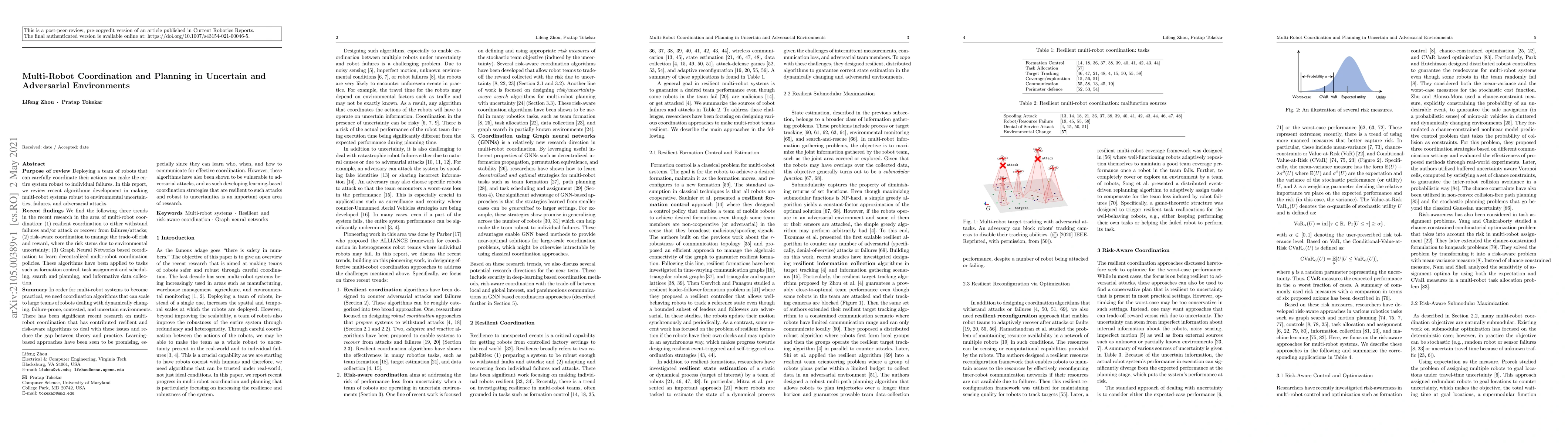 Deploying a team of robots that can carefully coordinate their actions can make the entire system robust to individual failures. In this report, we review recent algorithmic development in making multi-robot systems robust to environmental uncertainties, failures, and adversarial attacks. We find the following three trends in the recent research in the area of multi-robot coordination: (1) resilient coordination to either withstand failures and/or attack or recover from failures/attacks; (2) risk-aware coordination to manage the trade-off risk and reward, where the risk stems due to environmental uncertainty; (3) Graph Neural Networks based coordination to learn decentralized multi-robot coordination policies. These algorithms have been applied to tasks such as formation control, task assignment and scheduling, search and planning, and informative data collection. In order for multi-robot systems to become practical, we need coordination algorithms that can scale to large teams of robots dealing with dynamically changing, failure-prone, contested, and uncertain environments. There has been significant recent research on multi-robot coordination that has contributed resilient and risk-aware algorithms to deal with these issues and reduce the gap between theory and practice. Learning-based approaches have been seen to be promising, especially since they can learn who, when, and how to communicate for effective coordination. However, these algorithms have also been shown to be vulnerable to adversarial attacks, and as such developing learning-based coordination strategies that are resilient to such attacks and robust to uncertainties is an important open area of research.