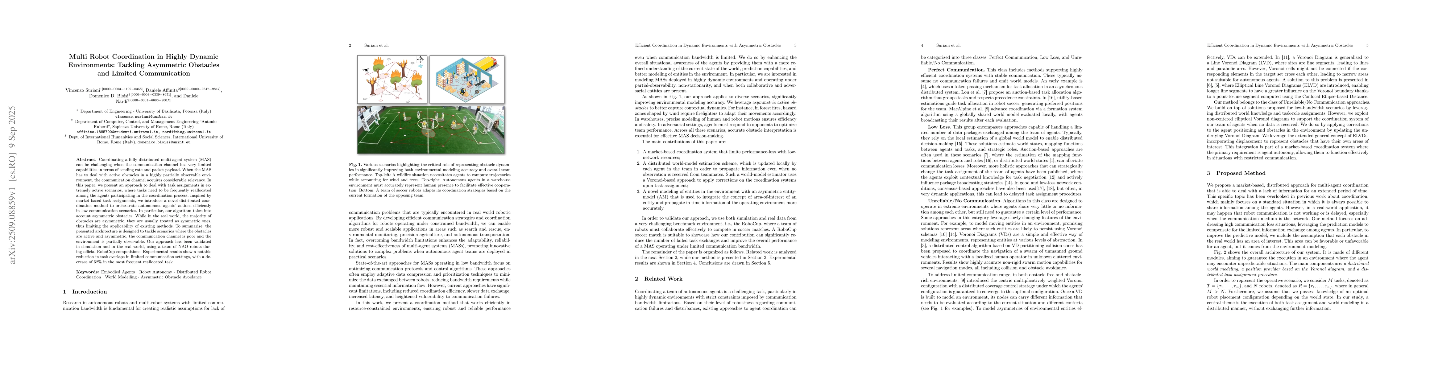 Coordinating a fully distributed multi-agent system (MAS) can be challenging when the communication channel has very limited capabilities in terms of sending rate and packet payload. When the MAS has to deal with active obstacles in a highly partially observable environment, the communication channel acquires considerable relevance. In this paper, we present an approach to deal with task assignments in extremely active scenarios, where tasks need to be frequently reallocated among the agents participating in the coordination process. Inspired by market-based task assignments, we introduce a novel distributed coordination method to orchestrate autonomous agents' actions efficiently in low communication scenarios. In particular, our algorithm takes into account asymmetric obstacles. While in the real world, the majority of obstacles are asymmetric, they are usually treated as symmetric ones, thus limiting the applicability of existing methods. To summarize, the presented architecture is designed to tackle scenarios where the obstacles are active and asymmetric, the communication channel is poor and the environment is partially observable. Our approach has been validated in simulation and in the real world, using a team of NAO robots during official RoboCup competitions. Experimental results show a notable reduction in task overlaps in limited communication settings, with a decrease of 52% in the most frequent reallocated task.