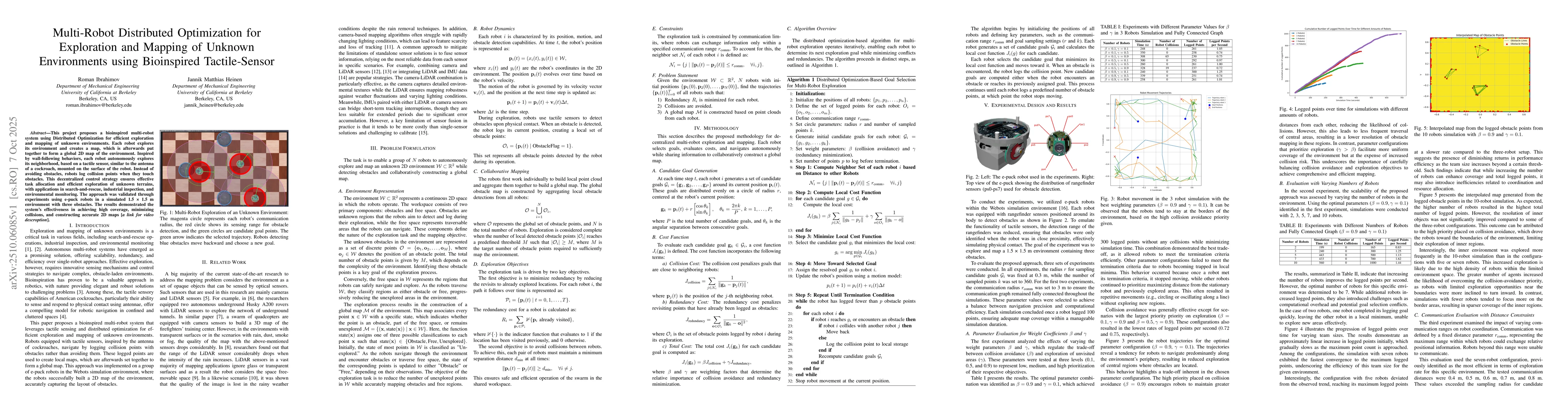 This research advances multi-robot exploration in unknown environments by combining bioinspired tactile sensing with decentralized optimization. It offers scalable solutions for search and rescue, industrial inspection, and environmental monitoring, improving efficiency and robustness in dynamic settings.