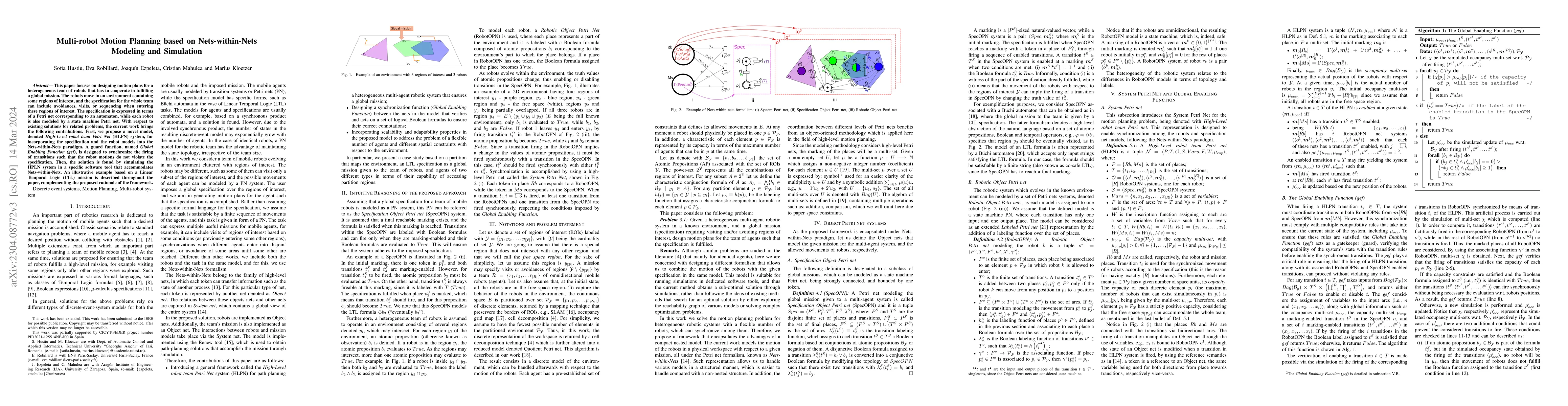 This paper introduces a novel multi-robot motion planning method using a Nets-within-Nets framework with HLPN systems to synchronize robot actions according to a global mission specification, employing a Global Enabling Function to prevent specification violations. The approach is demonstrated through an example involving Linear Temporal Logic missions.