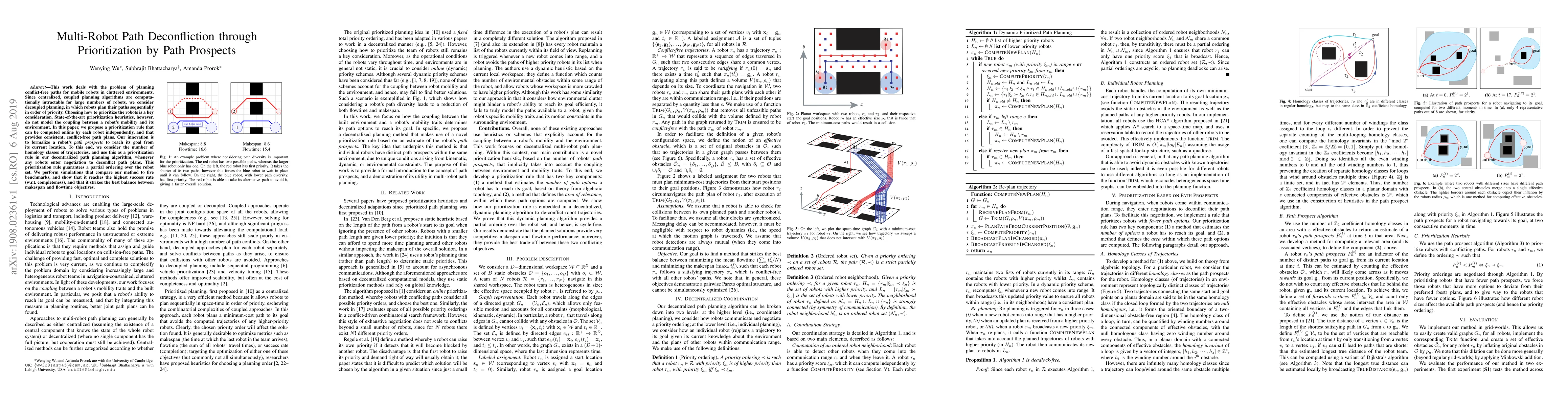 This work deals with the problem of planning conflict-free paths for mobile robots in cluttered environments. Since centralized, coupled planning algorithms are computationally intractable for large numbers of robots, we consider decoupled planning, in which robots plan their paths sequentially in order of priority. Choosing how to prioritize the robots is a key consideration. State-of-the-art prioritization heuristics, however, do not model the coupling between a robot's mobility and its environment. In this paper, we propose a prioritization rule that can be computed online by each robot independently, and that provides consistent, conflict-free path plans. Our innovation is to formalize a robot's path prospects to reach its goal from its current location. To this end, we consider the number of homology classes of trajectories, and use this as a prioritization rule in our decentralized path planning algorithm, whenever any robots enter negotiation to deconflict path plans. This prioritization rule guarantees a partial ordering over the robot set. We perform simulations that compare our method to five benchmarks, and show that it reaches the highest success rate (w.r.t. completeness), and that it strikes the best balance between makespan and flowtime objectives.