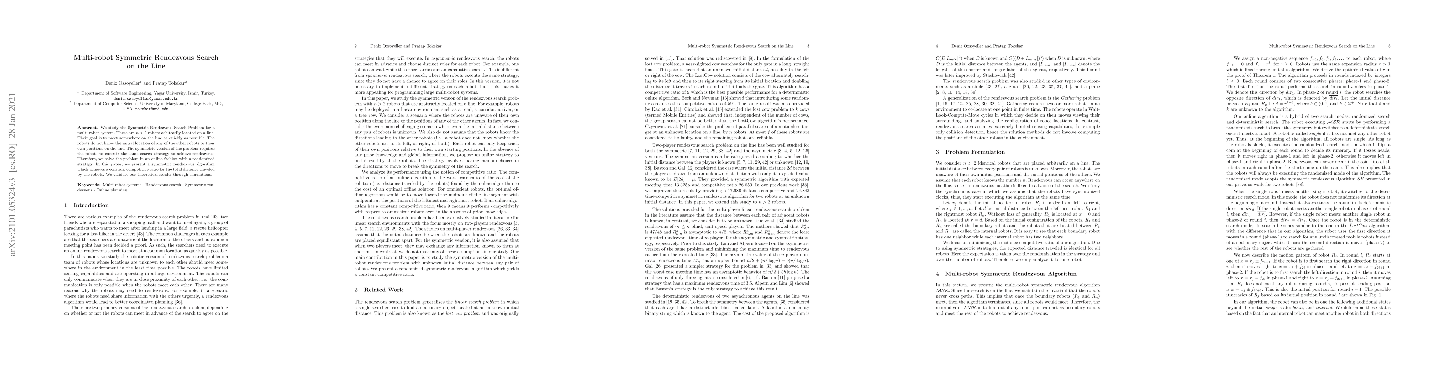 We study the Symmetric Rendezvous Search Problem for a multi-robot system. There are $n>2$ robots arbitrarily located on a line. Their goal is to meet somewhere on the line as quickly as possible. The robots do not know the initial location of any of the other robots or their own positions on the line. The symmetric version of the problem requires the robots to execute the same search strategy to achieve rendezvous. Therefore, we solve the problem in an online fashion with a randomized strategy. In this paper, we present a symmetric rendezvous algorithm which achieves a constant competitive ratio for the total distance traveled by the robots. We validate our theoretical results through simulations.