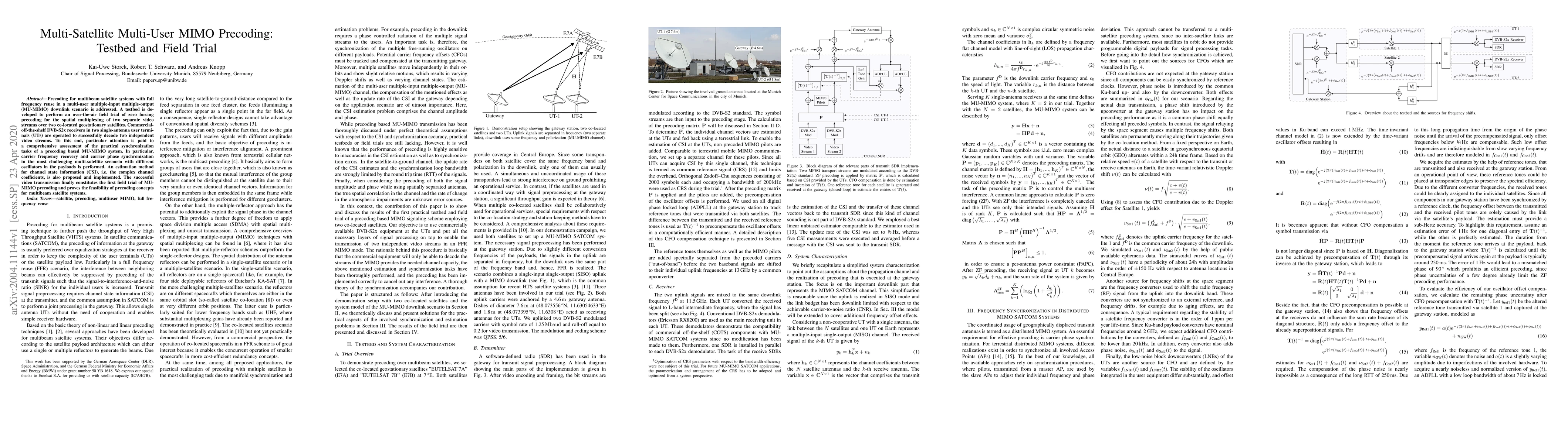 Precoding for multibeam satellite systems with full frequency reuse in a multi-user multiple-input multiple-output (MU-MIMO) downlink scenario is addressed. A testbed is developed to perform an over-the-air field trial of zero forcing precoding for the spatial multiplexing of two separate video streams over two co-located geostationary satellites. Commercial-off-the-shelf DVB-S2x receivers in two single-antenna user terminals (UTs) are operated to successfully decode two independent video streams. To this end, particular attention is paid to a comprehensive assessment of the practical synchronization tasks of a precoding based MU-MIMO system. In particular, carrier frequency recovery and carrier phase synchronization in the most challenging multi-satellite scenario with different oscillators in the payloads is performed. An estimation method for channel state information (CSI), i.e. the complex channel coefficients, is also proposed and implemented. The successful video transmission finally constitutes the first field trial of MU-MIMO precoding and proves the feasibility of precoding concepts for multibeam satellite systems.