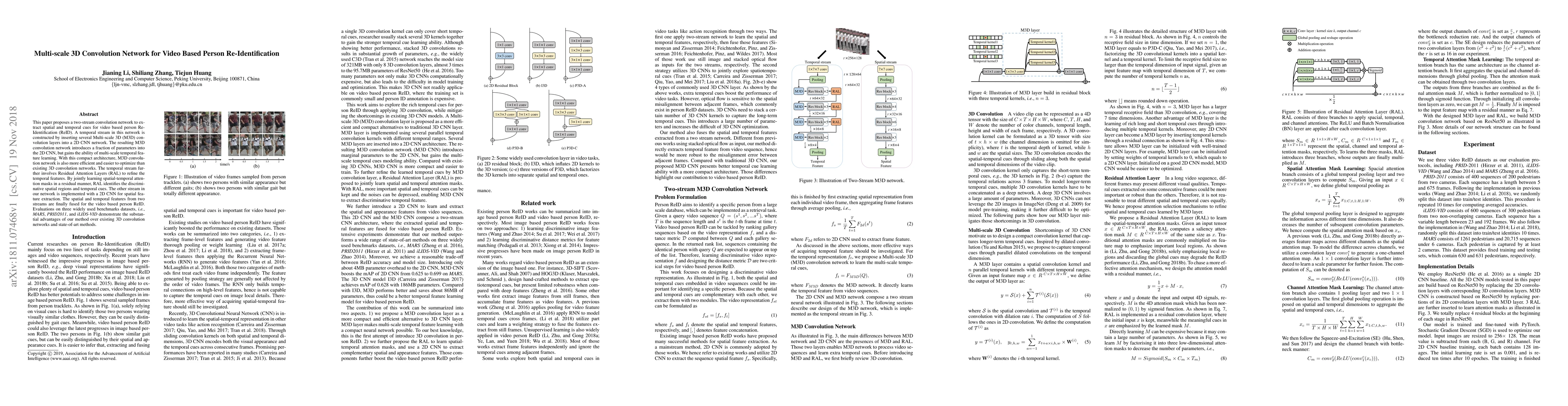 This paper introduces a two-stream convolution network for video-based person re-identification, utilizing Multi-scale 3D convolution layers for temporal feature extraction and 2D CNN for spatial features, with Residual Attention Layers to refine temporal features, achieving superior performance on benchmark datasets.