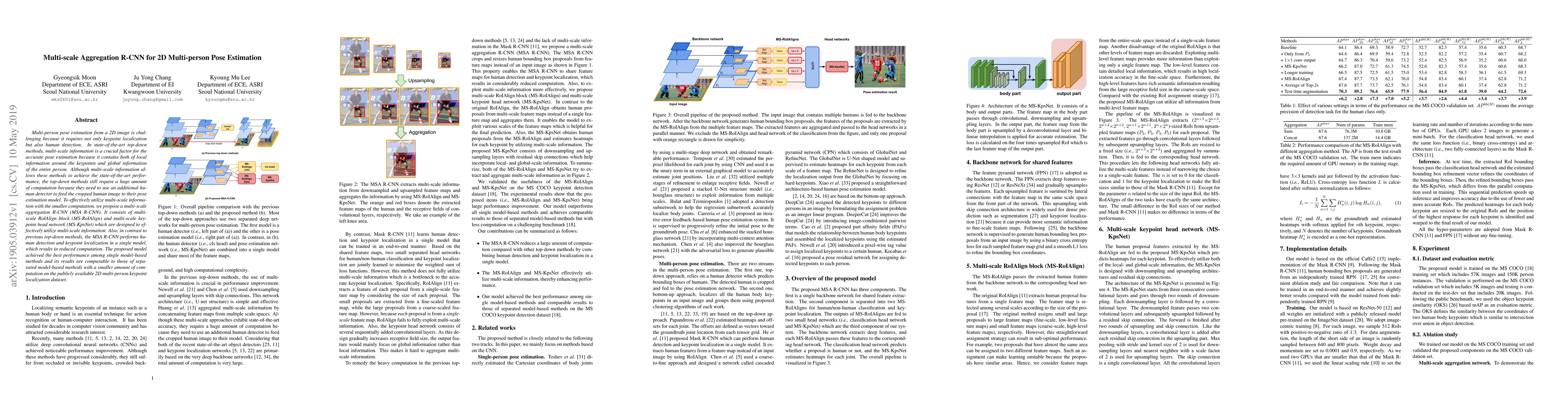 The paper proposes a multi-scale aggregation R-CNN (MSA R-CNN) for efficient 2D multi-person pose estimation, integrating human detection and keypoint localization in a single model to reduce computation and achieve state-of-the-art performance comparable to separated model methods.