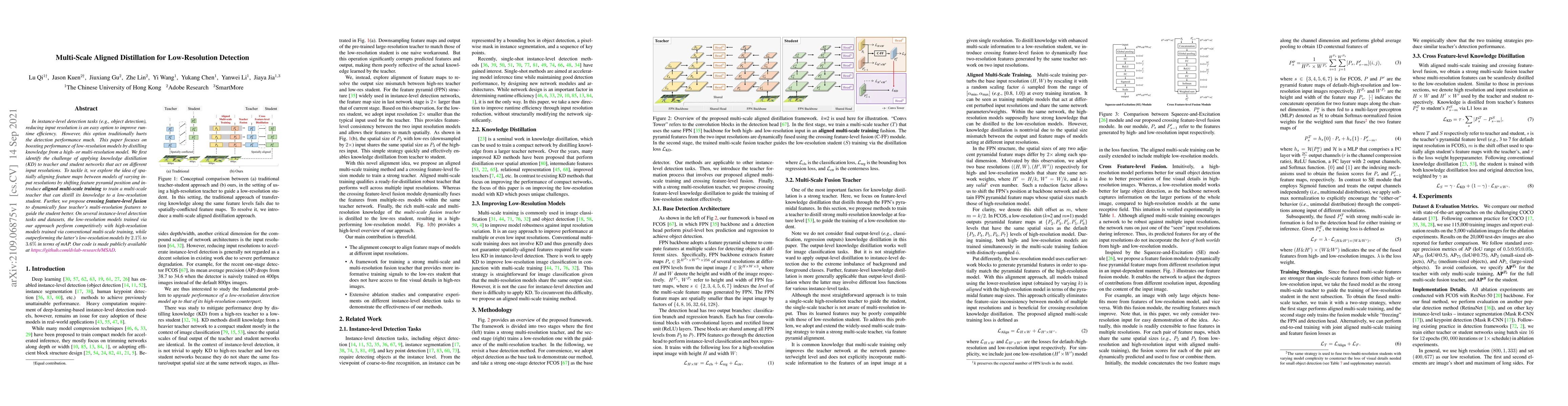 In instance-level detection tasks (e.g., object detection), reducing input resolution is an easy option to improve runtime efficiency. However, this option traditionally hurts the detection performance much. This paper focuses on boosting the performance of low-resolution models by distilling knowledge from a high- or multi-resolution model. We first identify the challenge of applying knowledge distillation (KD) to teacher and student networks that act on different input resolutions. To tackle it, we explore the idea of spatially aligning feature maps between models of varying input resolutions by shifting feature pyramid positions and introduce aligned multi-scale training to train a multi-scale teacher that can distill its knowledge to a low-resolution student. Further, we propose crossing feature-level fusion to dynamically fuse teacher's multi-resolution features to guide the student better. On several instance-level detection tasks and datasets, the low-resolution models trained via our approach perform competitively with high-resolution models trained via conventional multi-scale training, while outperforming the latter's low-resolution models by 2.1% to 3.6% in terms of mAP. Our code is made publicly available at https://github.com/dvlab-research/MSAD.