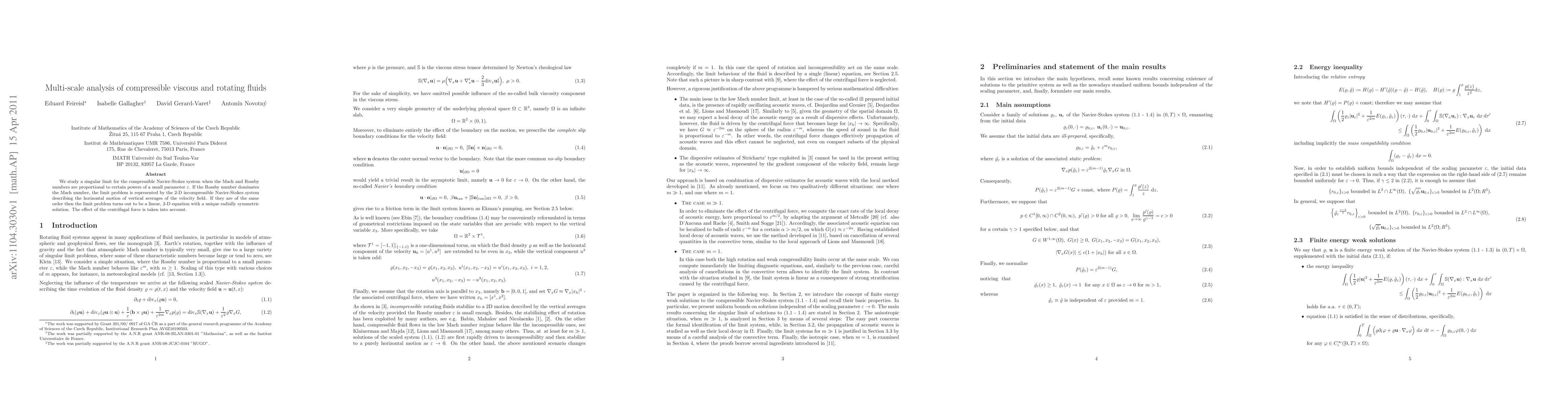 We study a singular limit for the compressible Navier-Stokes system when the Mach and Rossby numbers are proportional to certain powers of a small parameter $\ep$. If the Rossby number dominates the Mach number, the limit problem is represented by the 2-D incompressible Navier-Stokes system describing the horizontal motion of vertical averages of the velocity field. If they are of the same order then the limit problem turns out to be a linear, 2-D equation with a unique radially symmetric solution. The effect of the centrifugal force is taken into account.