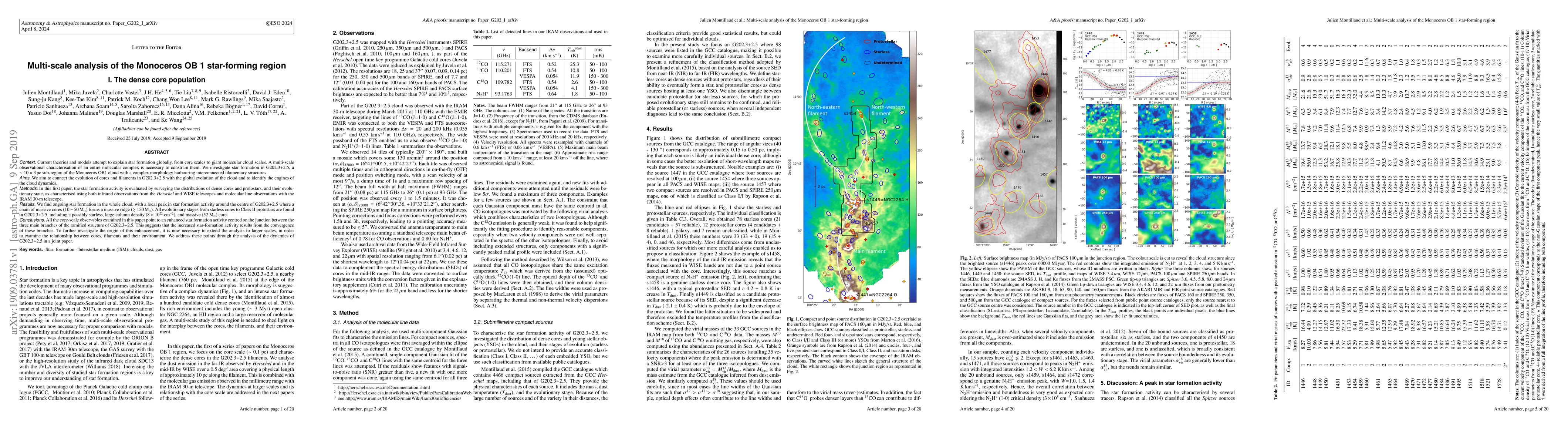 Current theories and models attempt to explain star formation globally, from core scales to giant molecular cloud scales. A multi-scale observational characterisation of an entire molecular complex is necessary to constrain them. We investigate star formation in G202.3+2.5, a ~10x3 pc sub-region of the Monoceros OB1 cloud with a complex morphology harbouring interconnected filamentary structures. We aim to connect the evolution of cores and filaments in G202.3+2.5 with the global evolution of the cloud and to identify the engines of the cloud dynamics. In this first paper, the star formation activity is evaluated by surveying the distributions of dense cores and protostars, and their evolutionary state, as characterised using both infrared observations from the Herschel and WISE telescopes and molecular line observations with the IRAM 30-m telescope. We find ongoing star formation in the whole cloud, with a local peak in star formation activity around the centre of G202.3+2.5 where a chain of massive cores (10-50 Msun) forms a massive ridge (>150 Msun). All evolutionary stages from starless cores to Class II protostars are found in G202.3+2.5, including a possibly starless, large column density (8x10^{22} cm-2), and massive (52 Msun) core. All the core-scale observables examined in this paper point to an enhanced star formation activity centred on the junction between the three main branches of the ramified structure of G202.3+2.5. This suggests that the increased star-formation activity results from the convergence of these branches. To further investigate the origin of this enhancement, it is now necessary to extend the analysis to larger scales, in order to examine the relationship between cores, filaments and their environment. We address these points through the analysis of the dynamics of G202.3+2.5 in a joint paper.