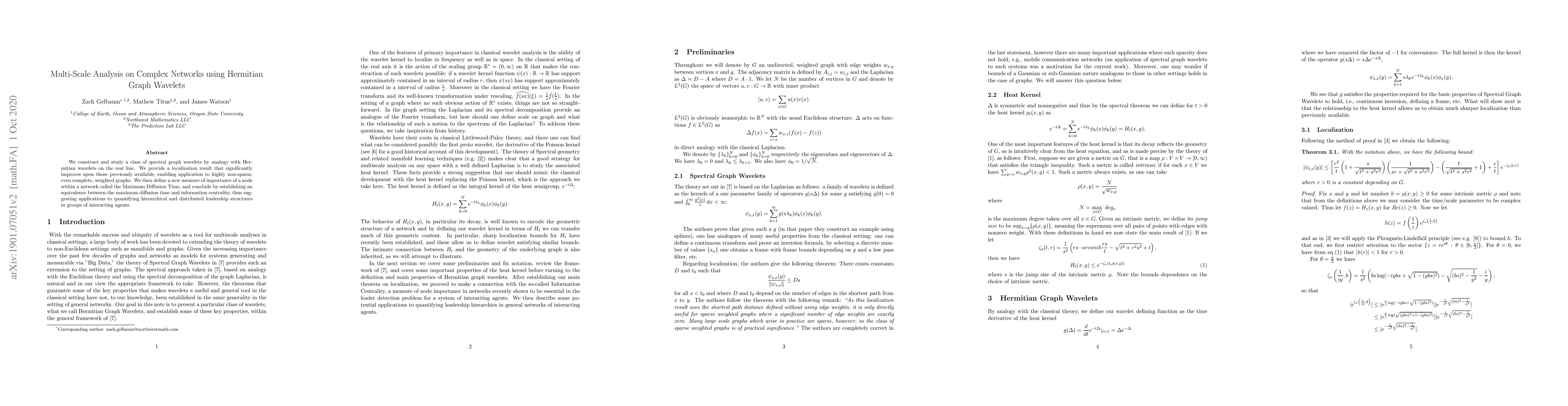 Researchers develop a new method to analyze complex networks using Hermitian graph wavelets, enabling them to quantify hierarchical leadership structures in groups of interacting agents. They establish an equivalence between maximum diffusion time and information centrality, suggesting applications in understanding distributed leadership.