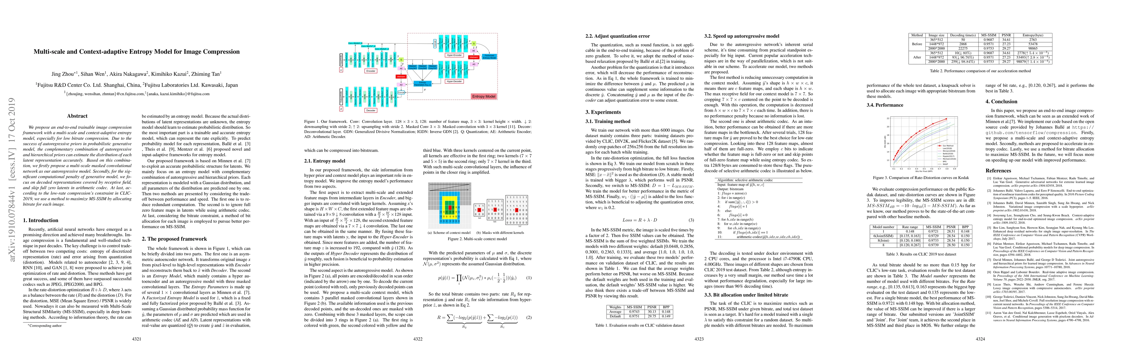 This paper introduces an end-to-end trainable image compression framework using a multi-scale, context-adaptive entropy model for low bitrate compression, combining autoregressive and hierarchical priors for accurate latent representation distribution estimation. The proposed method maximizes MS-SSIM by allocating bitrate based on image-specific needs.