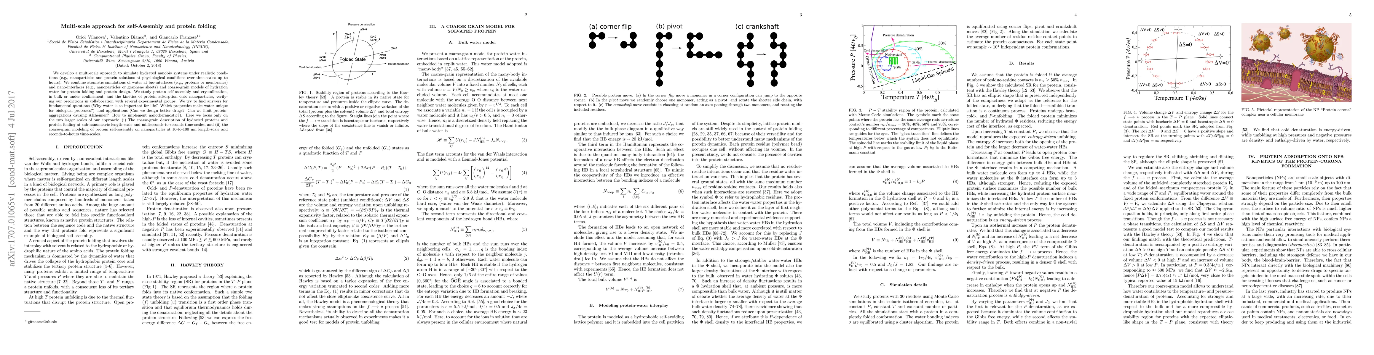 We develop a multi-scale approach to simulate hydrated nanobio systems under realistic condi- tions (e.g., nanoparticles and protein solutions at physiological conditions over time-scales up to hours). We combine atomistic simulations of water at bio-interfaces (e.g., proteins or membranes) and nano-interfaces (e.g., nanoparticles or graphene sheets) and coarse-grain models of hydration water for protein folding and protein design. We study protein self-assembly and crystallization, in bulk or under confinement, and the kinetics of protein adsorption onto nanoparticles, verify- ing our predictions in collaboration with several experimental groups. We try to find answers for fundamental questions (Why water is so important for life? Which properties make water unique for biological processes?) and applications (Can we design better drugs? Can we limit protein- aggregations causing Alzheimer? How to implement nanotheranostic?). Here we focus only on the two larger scales of our approach: (i) The coarse-grain description of hydrated proteins and protein folding at sub-nanometric length-scale and milliseconds-to-seconds time-scales, and (ii) the coarse-grain modeling of protein self-assembly on nanoparticles at 10-to-100 nm length-scale and seconds-to-hours time-scales.