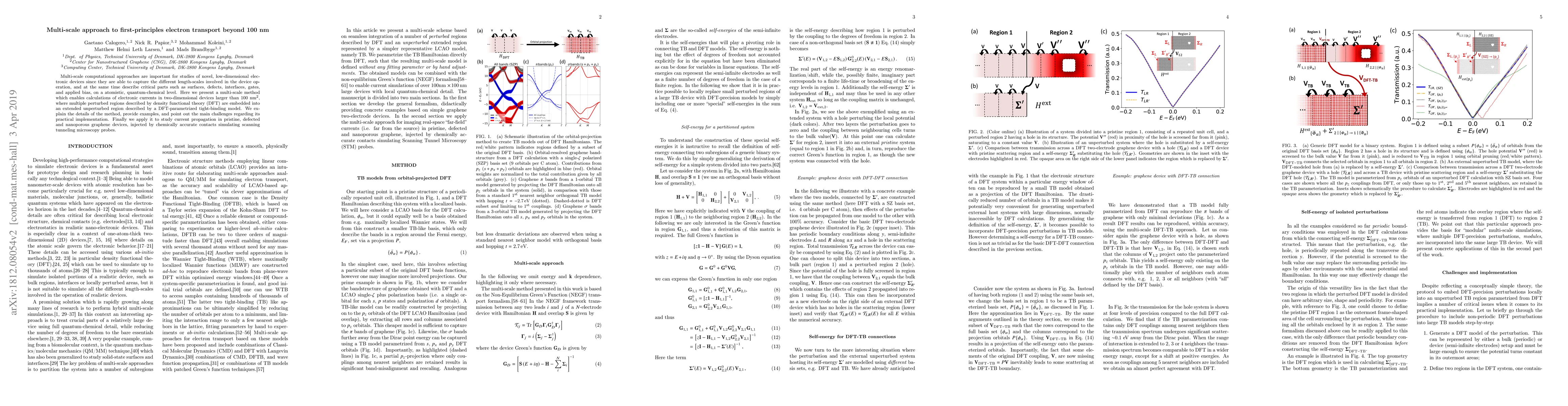 The paper presents a multi-scale method that combines density functional theory (DFT) and a tight-binding (TB) model to calculate electron transport in devices larger than 100 nm². It involves embedding perturbed regions described by DFT into an unperturbed region described by a DFT-parametrized TB model.