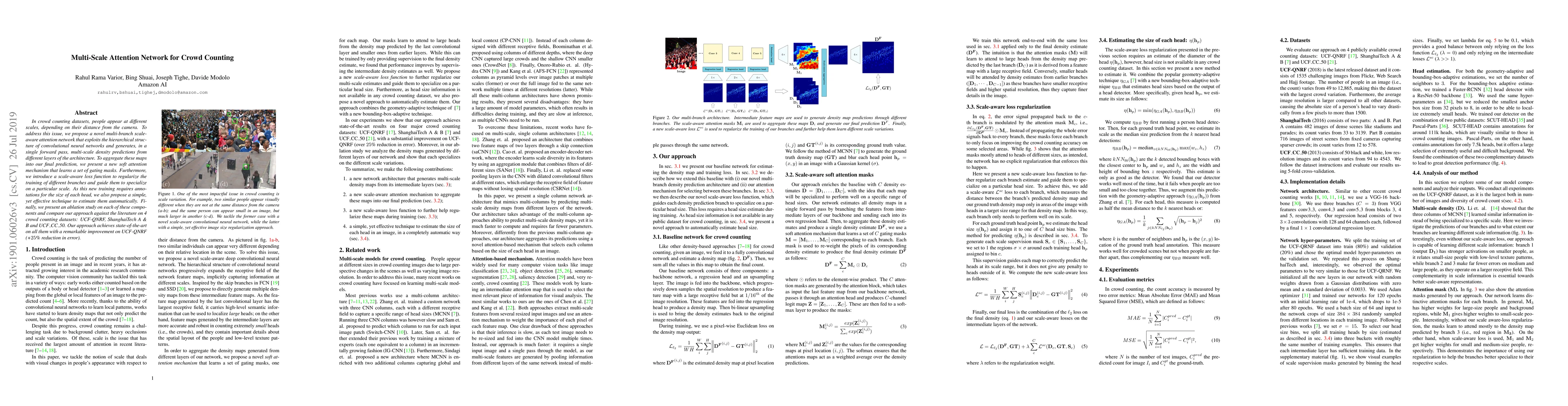 The paper proposes a multi-scale attention network for crowd counting that uses a multi-branch architecture to generate multi-scale density predictions and a soft attention mechanism to aggregate them. The approach achieves state-of-the-art results on multiple datasets, notably reducing error by 25% on UCF-QNRF.