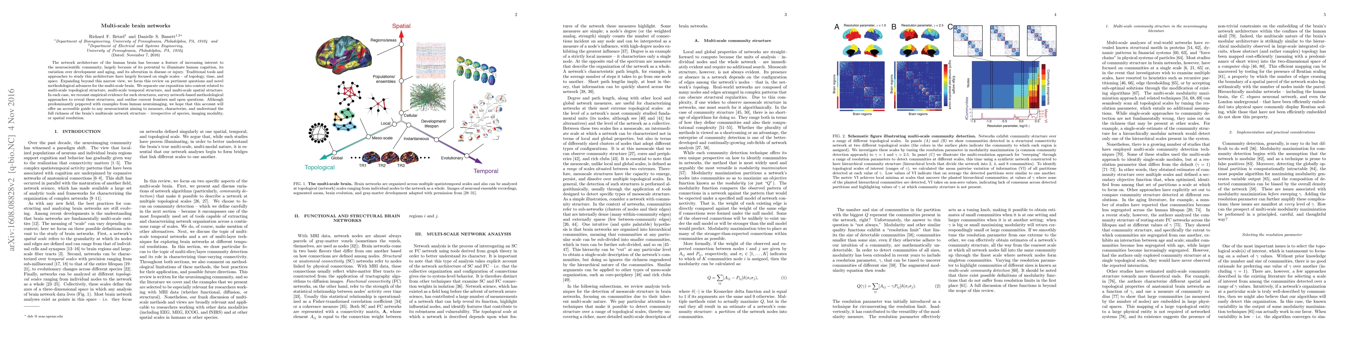 This paper reviews advances in understanding the multi-scale network architecture of the human brain, focusing on topological, temporal, and spatial structures. It surveys methodologies and highlights open questions, aiming to provide a comprehensive guide for neuroscientists.