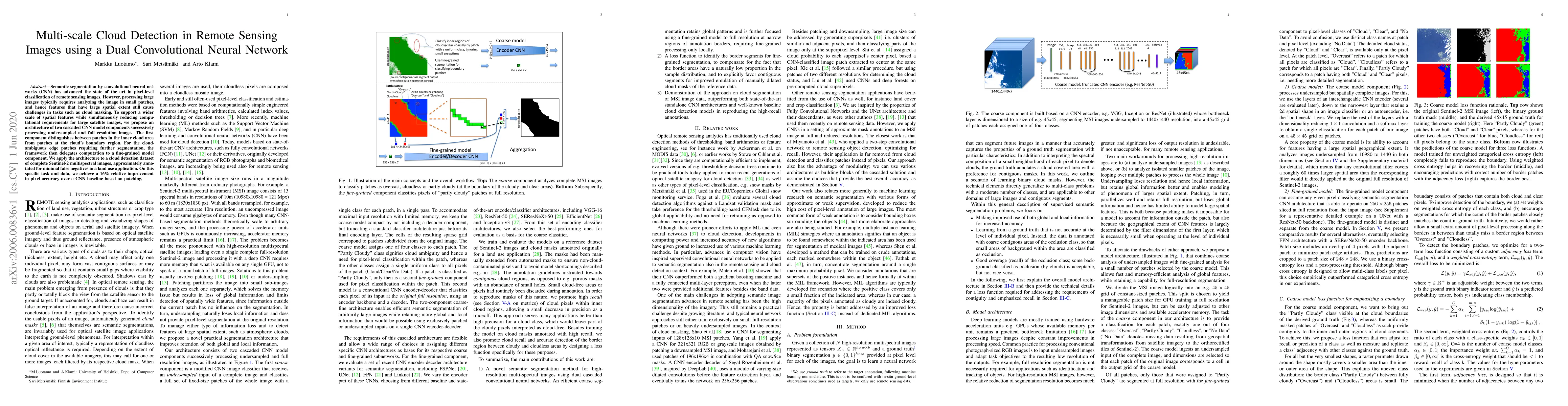 This paper proposes a dual convolutional neural network (CNN) architecture for multi-scale cloud detection in remote sensing images, achieving a 16% relative improvement in pixel accuracy over a baseline CNN. The model processes images in two stages: a coarse model for inner cloud areas and a fine-grained model for ambiguous boundary regions.