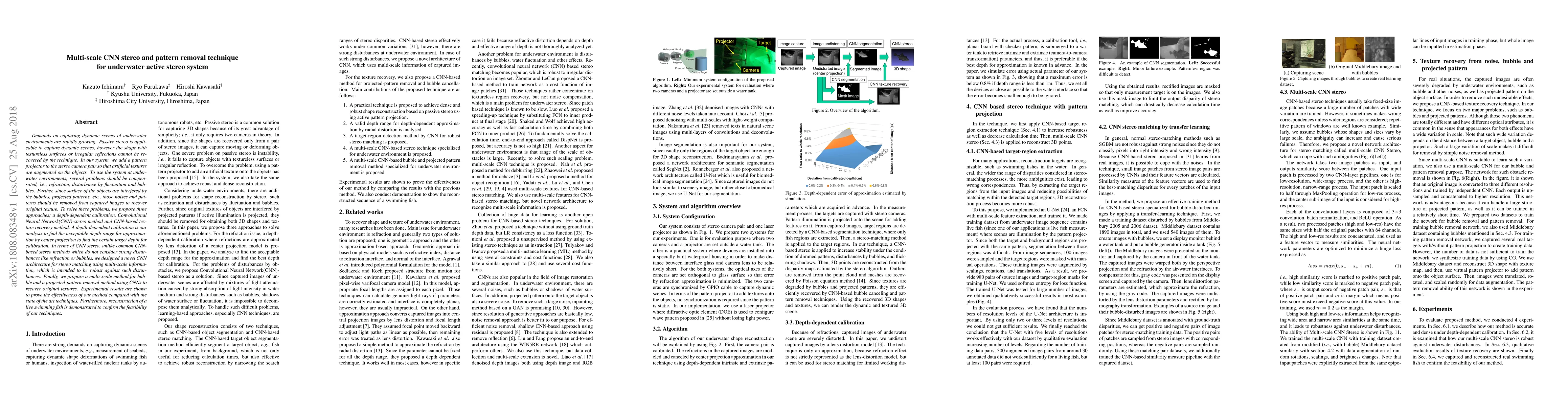 This research introduces a multi-scale Convolutional Neural Network (CNN) stereo and pattern removal technique for enhancing underwater active stereo systems. The proposed method addresses challenges such as refraction, bubbles, and textureless surfaces by integrating a pattern projector and employing depth-dependent calibration, a novel CNN-stereo architecture, and a multi-scale CNN-based texture recovery method. Experimental results demonstrate the effectiveness of the technique in capturing dynamic underwater scenes.