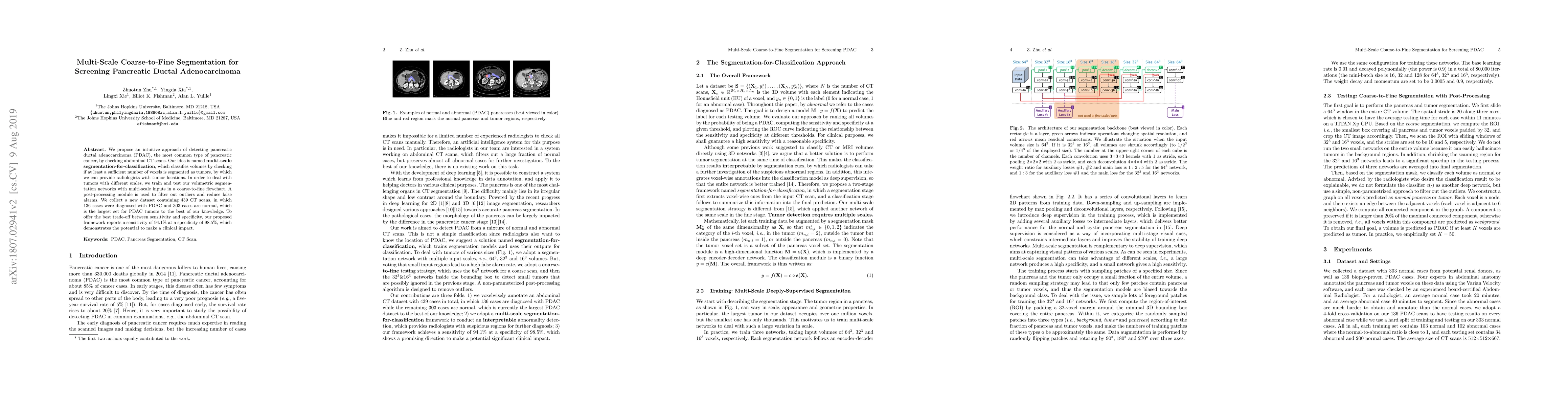 This paper introduces a multi-scale coarse-to-fine segmentation method for detecting pancreatic ductal adenocarcinoma in abdominal CT scans, achieving high sensitivity and specificity. The proposed framework uses a new dataset of 439 CT scans, reporting 94.1% sensitivity and 98.5% specificity, indicating significant clinical potential.