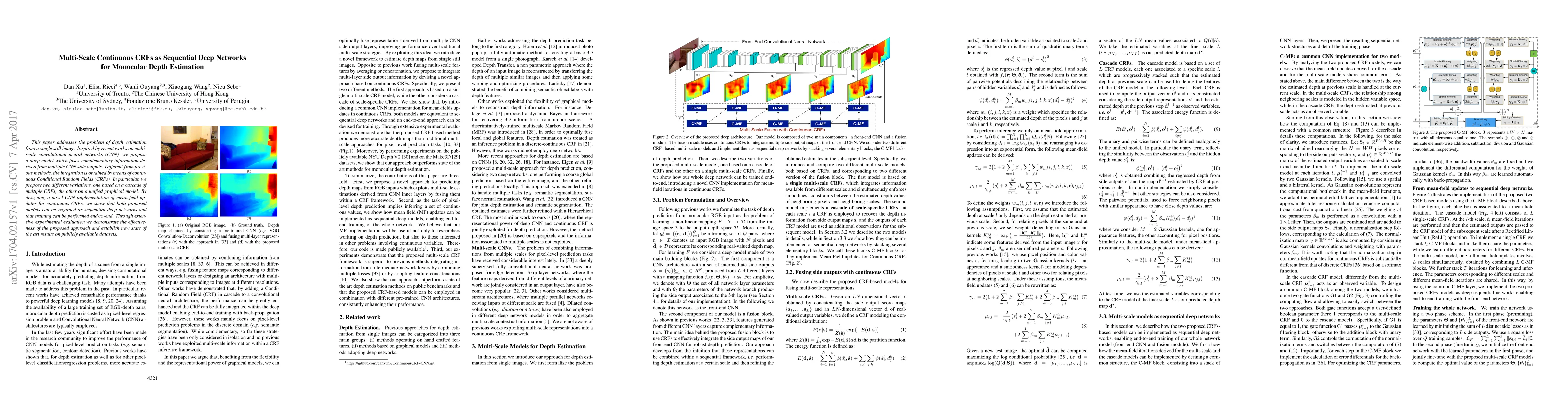 This paper addresses the problem of depth estimation from a single still image. Inspired by recent works on multi- scale convolutional neural networks (CNN), we propose a deep model which fuses complementary information derived from multiple CNN side outputs. Different from previous methods, the integration is obtained by means of continuous Conditional Random Fields (CRFs). In particular, we propose two different variations, one based on a cascade of multiple CRFs, the other on a unified graphical model. By designing a novel CNN implementation of mean-field updates for continuous CRFs, we show that both proposed models can be regarded as sequential deep networks and that training can be performed end-to-end. Through extensive experimental evaluation we demonstrate the effective- ness of the proposed approach and establish new state of the art results on publicly available datasets.