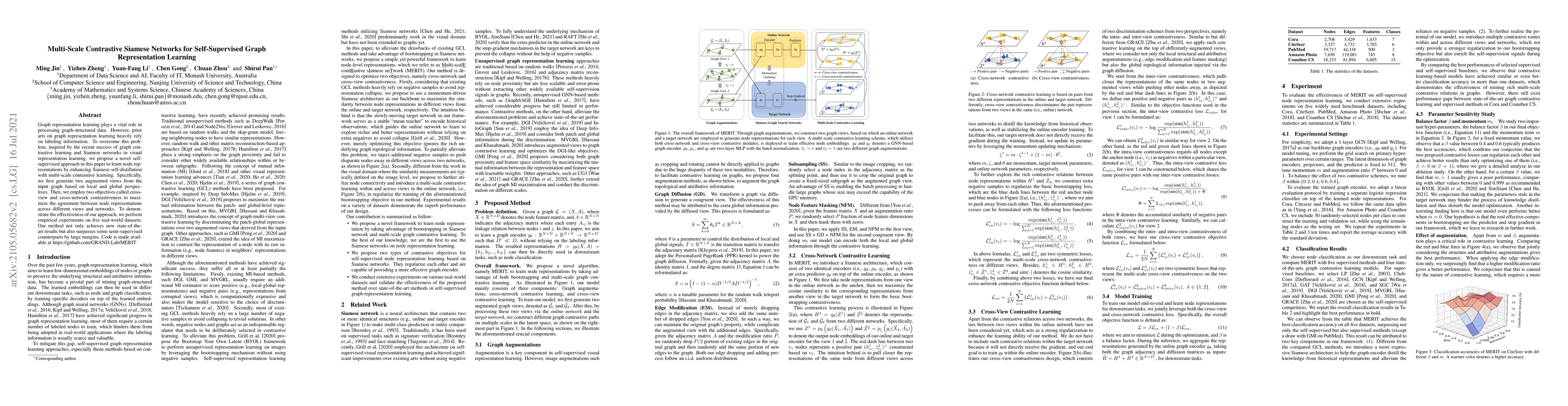 This paper proposes a self-supervised method using multi-scale contrastive Siamese networks to learn graph representations without relying on labeled data. The approach generates augmented views from the input graph and employs contrastive learning to enhance node representations, achieving state-of-the-art results on multiple datasets.