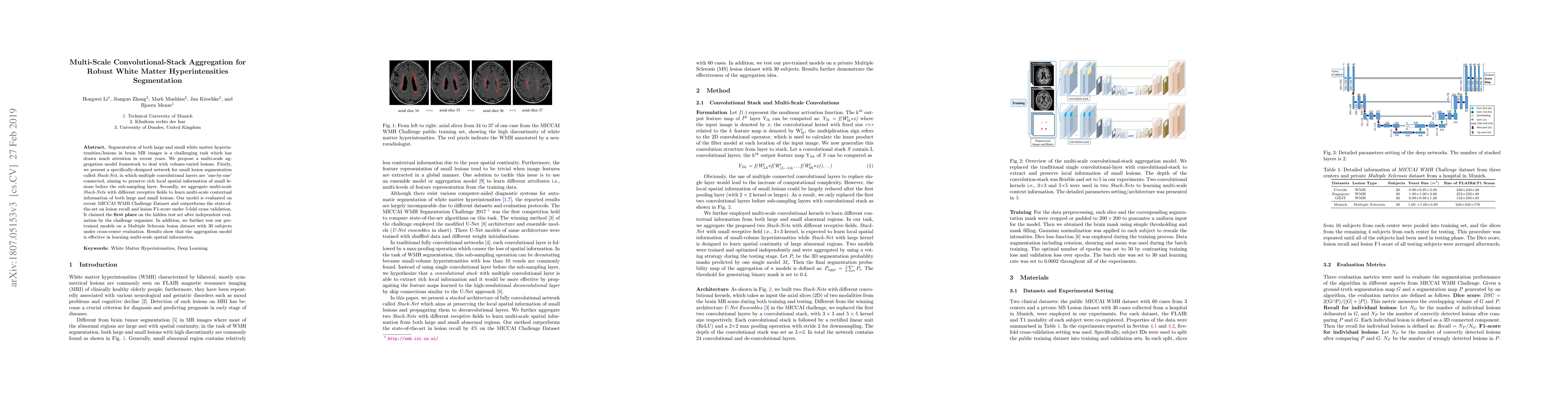 This paper proposes a multi-scale convolutional-stack aggregation model for segmenting both large and small white matter hyperintensities in brain MR images. The Stack-Net network preserves local spatial information, while multi-scale aggregation enhances contextual learning, achieving top results in MICCAI WMH Challenge and cross-center evaluations.