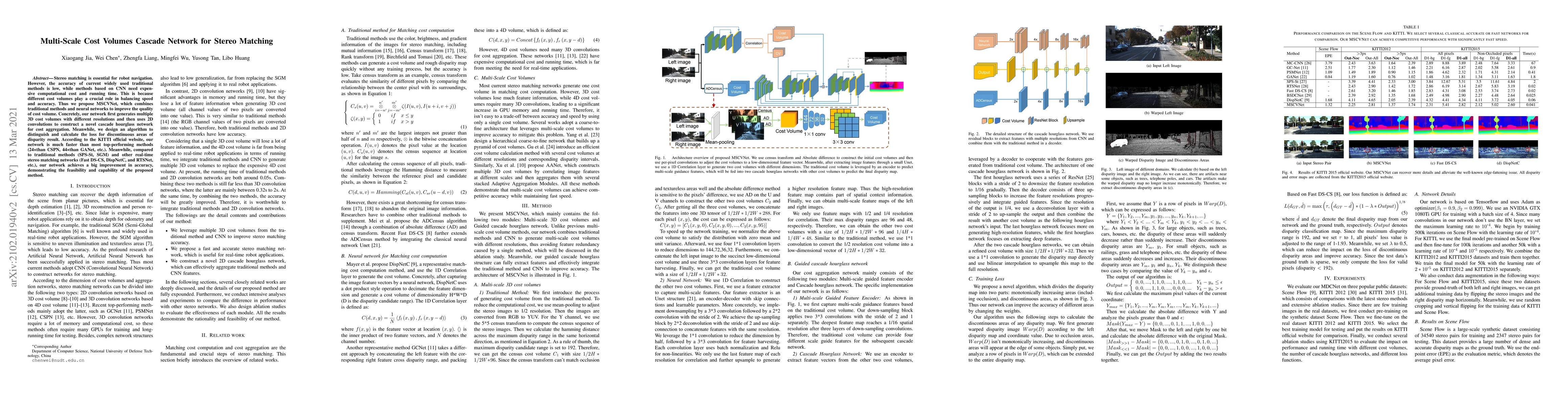 The paper proposes MSCVNet, a multi-scale cost volume cascade network for stereo matching that combines traditional methods with neural networks to improve cost volume quality. The network generates multiple 3D cost volumes at different resolutions and employs a cascade hourglass network for efficient cost aggregation, achieving both faster processing and higher accuracy compared to existing methods.