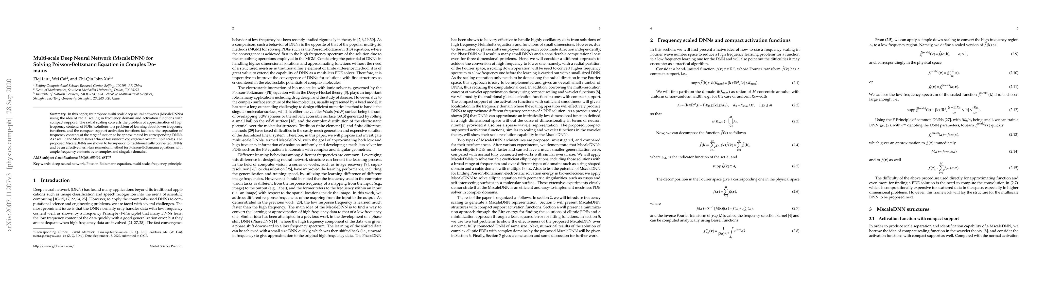 In this paper, we propose multi-scale deep neural networks (MscaleDNNs) using the idea of radial scaling in frequency domain and activation functions with compact support. The radial scaling converts the problem of approximation of high frequency contents of PDEs' solutions to a problem of learning about lower frequency functions, and the compact support activation functions facilitate the separation of frequency contents of the target function to be approximated by corresponding DNNs. As a result, the MscaleDNNs achieve fast uniform convergence over multiple scales. The proposed MscaleDNNs are shown to be superior to traditional fully connected DNNs and be an effective mesh-less numerical method for Poisson-Boltzmann equations with ample frequency contents over complex and singular domains.