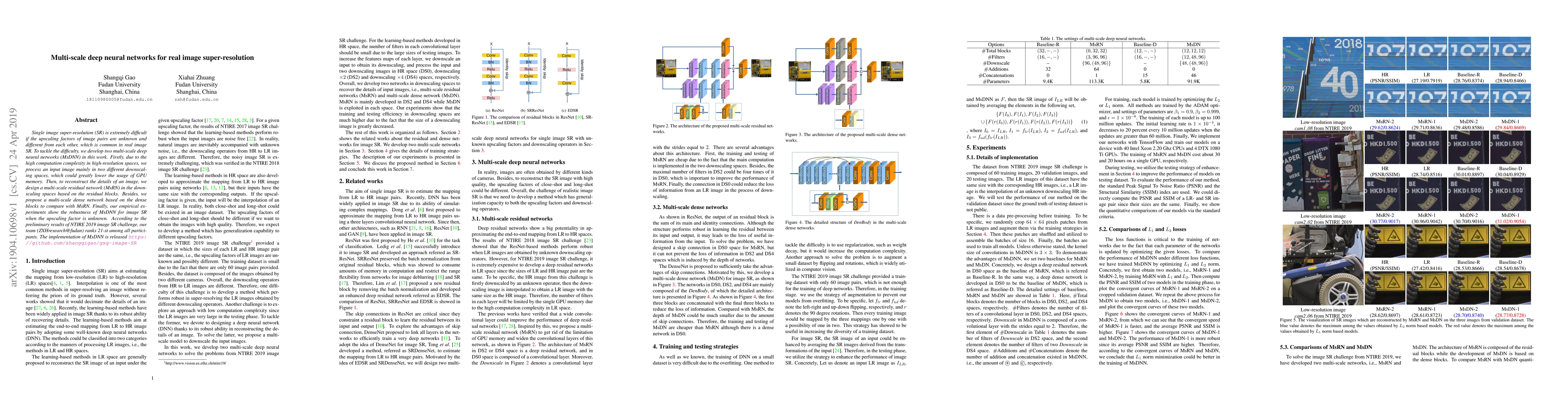 Single image super-resolution (SR) is extremely difficult if the upscaling factors of image pairs are unknown and different from each other, which is common in real image SR. To tackle the difficulty, we develop two multi-scale deep neural networks (MsDNN) in this work. Firstly, due to the high computation complexity in high-resolution spaces, we process an input image mainly in two different downscaling spaces, which could greatly lower the usage of GPU memory. Then, to reconstruct the details of an image, we design a multi-scale residual network (MsRN) in the downscaling spaces based on the residual blocks. Besides, we propose a multi-scale dense network based on the dense blocks to compare with MsRN. Finally, our empirical experiments show the robustness of MsDNN for image SR when the upscaling factor is unknown. According to the preliminary results of NTIRE 2019 image SR challenge, our team (ZXHresearch@fudan) ranks 21-st among all participants. The implementation of MsDNN is released https://github.com/shangqigao/gsq-image-SR