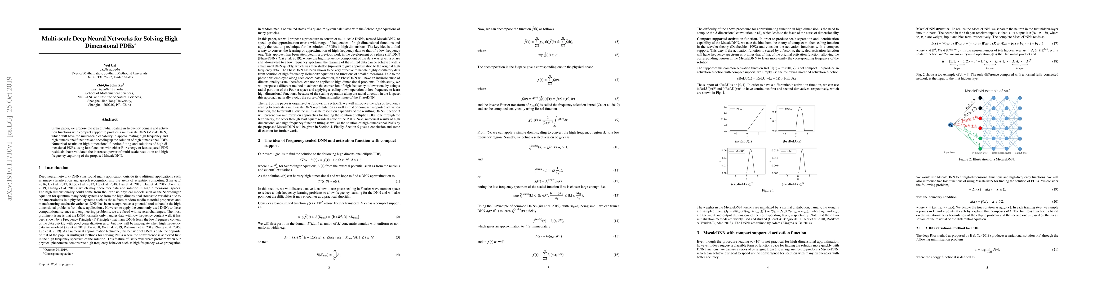 This paper introduces a multi-scale deep neural network (MscaleDNN) using radial scaling and compact support activation functions to efficiently solve high-dimensional partial differential equations (PDEs). The proposed method demonstrates enhanced accuracy and speed in approximating high-frequency functions and PDE solutions.