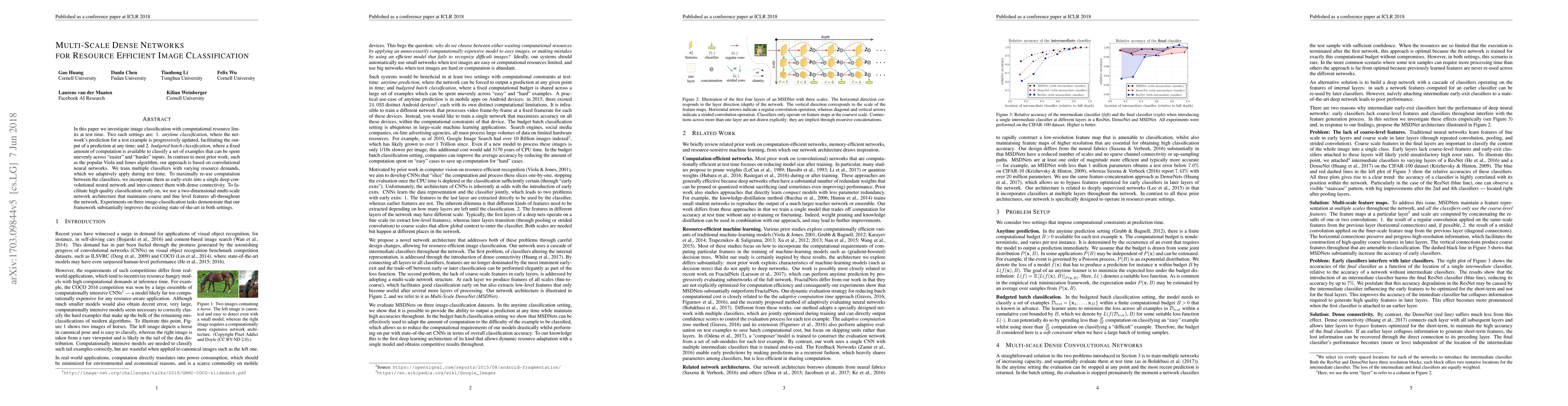 In this paper we investigate image classification with computational resource limits at test time. Two such settings are: 1. anytime classification, where the network's prediction for a test example is progressively updated, facilitating the output of a prediction at any time; and 2. budgeted batch classification, where a fixed amount of computation is available to classify a set of examples that can be spent unevenly across "easier" and "harder" inputs. In contrast to most prior work, such as the popular Viola and Jones algorithm, our approach is based on convolutional neural networks. We train multiple classifiers with varying resource demands, which we adaptively apply during test time. To maximally re-use computation between the classifiers, we incorporate them as early-exits into a single deep convolutional neural network and inter-connect them with dense connectivity. To facilitate high quality classification early on, we use a two-dimensional multi-scale network architecture that maintains coarse and fine level features all-throughout the network. Experiments on three image-classification tasks demonstrate that our framework substantially improves the existing state-of-the-art in both settings.