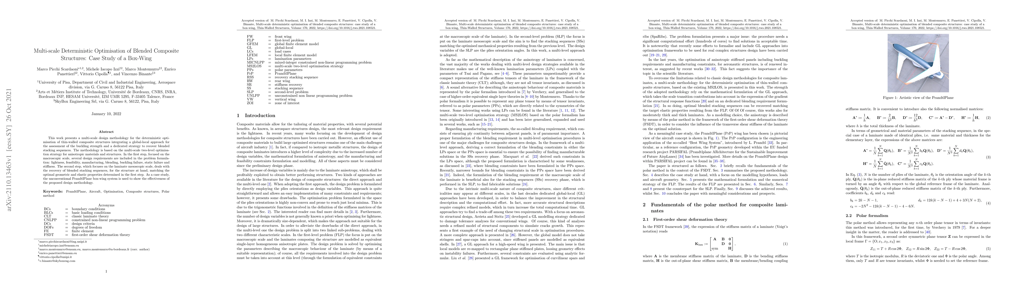 This work presents a multi-scale design methodology for the deterministic optimisation of thin-walled composite structures integrating a global-local approach for the assessment of the buckling strength and a dedicated strategy to recover blended stacking sequences. The methodology is based on the multi-scale two-level optimisation strategy for anisotropic materials and structures. In the first step, focused on the macroscopic scale, several design requirements are included in the problem formulation: lightness, feasibility, manufacturing, blending, buckling failure, static failure and stiffness. The second step, which focuses on the laminate mesoscopic scale, deals with the recovery of blended stacking sequences, for the structure at hand, matching the optimal geometric and elastic properties determined in the first step. As a case study, the unconventional PrandtlPlane box-wing system is used to show the effectiveness of the proposed design methodology.