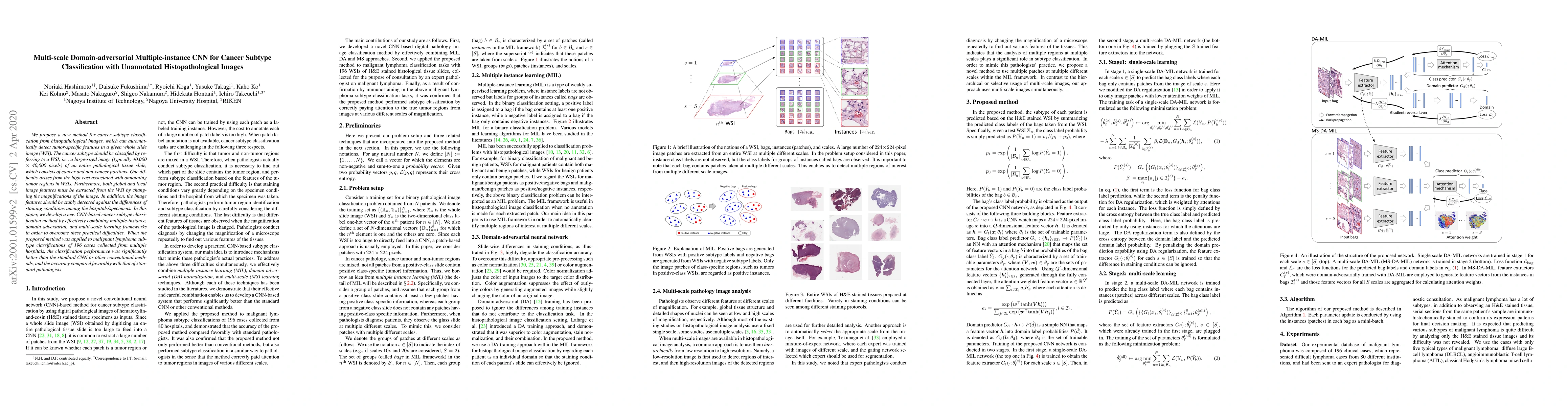This paper introduces a novel multi-scale domain-adversarial multiple-instance CNN method for cancer subtype classification from unannotated histopathological images. The method effectively extracts both global and local features from large-sized whole slide images, achieving superior classification performance compared to standard CNNs and conventional methods.