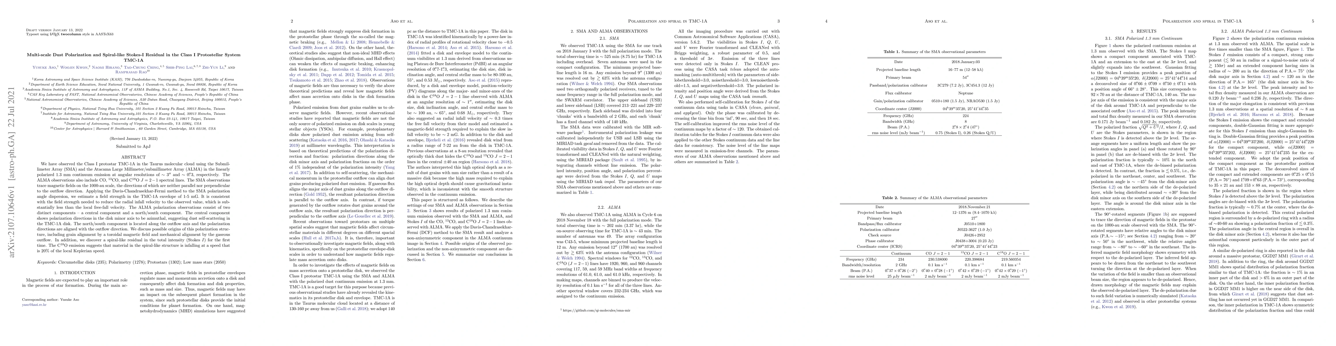 This study uses SMA and ALMA observations to analyze the magnetic fields and dust polarization in the Class I protostar TMC-1A, revealing a spiral-like residual in Stokes I and suggesting dust self-scattering in the disk and alignment by magnetic fields or outflow. The estimated magnetic field strength supports reduced radial infall velocity.