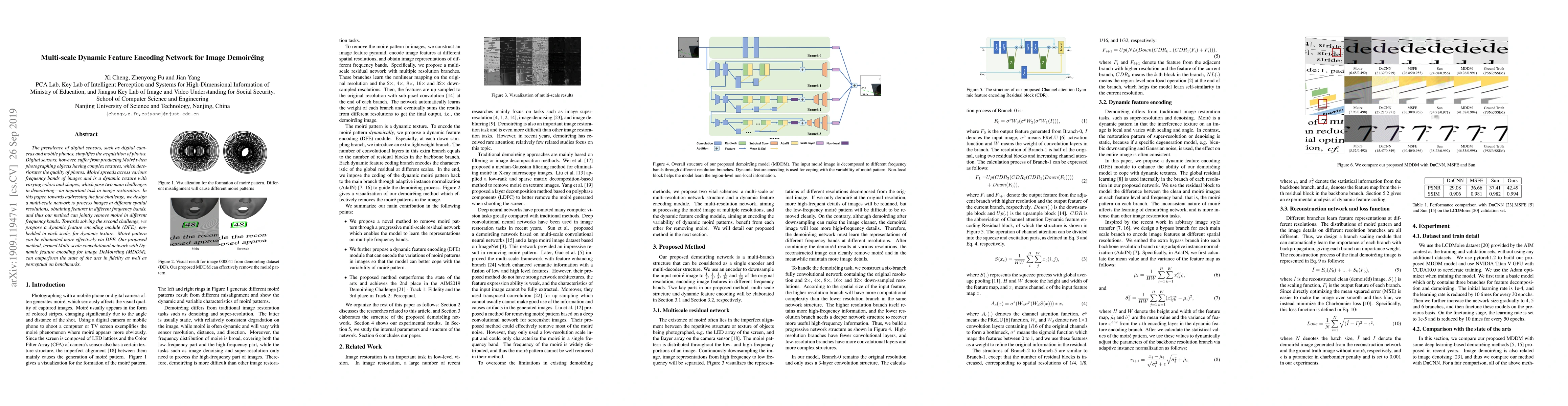 This paper proposes a multi-scale dynamic feature encoding network (MDDM) to effectively remove moire patterns from images, addressing challenges in processing dynamic textures across various frequency bands. The method combines multi-scale processing and a dynamic feature encoding module for superior performance compared to existing techniques.