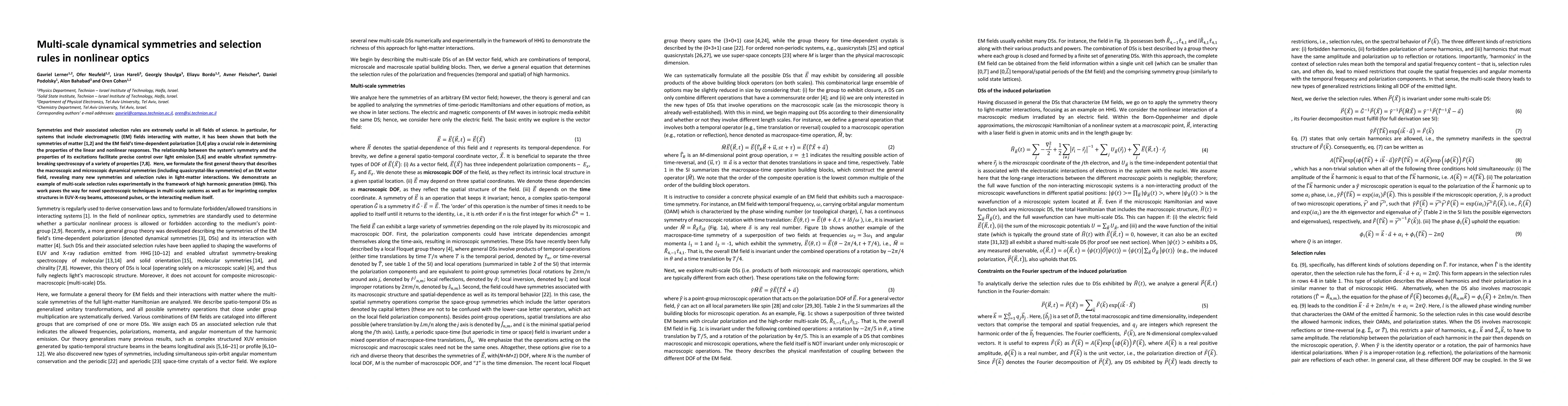 This paper formulates a general theory for macroscopic dynamical symmetries in electromagnetic fields interacting with matter, revealing new symmetries and selection rules in nonlinear optics. It demonstrates multi-scale selection rules experimentally in high harmonic generation, paving the way for novel spectroscopic techniques and advanced light manipulation.