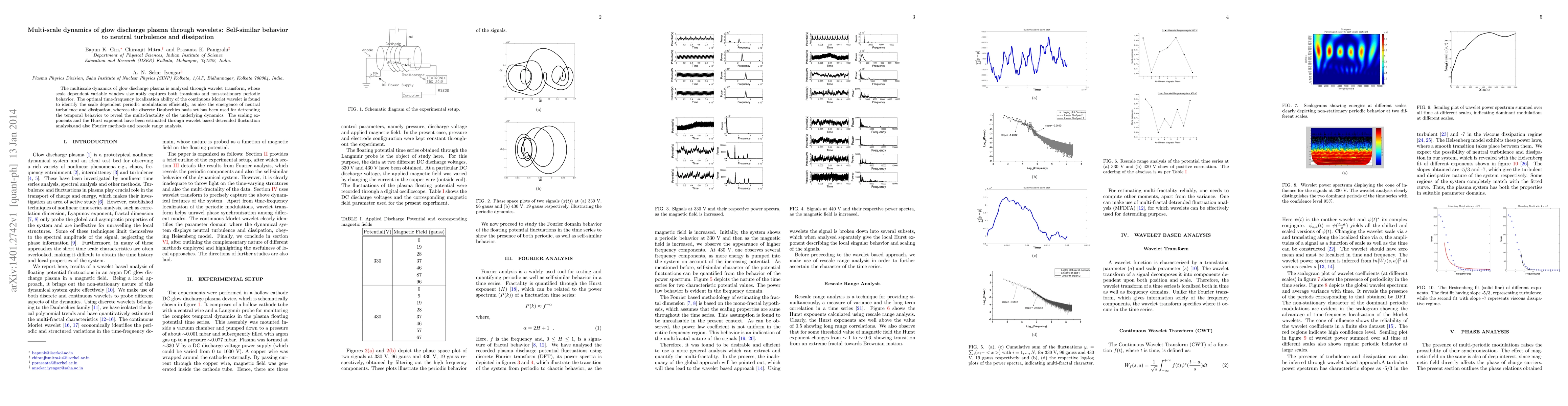 This paper analyzes the multiscale dynamics of glow discharge plasma using wavelet transforms, identifying self-similar behavior akin to neutral turbulence and dissipation. The continuous Morlet wavelet efficiently captures scale-dependent periodic modulations, while the discrete Daubechies basis set detrends temporal behavior to reveal underlying multi-fractality.
