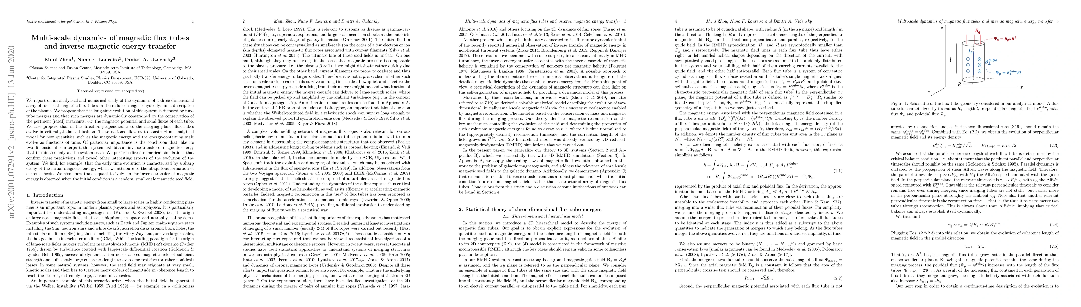 We report on an analytical and numerical study of the dynamics of a three-dimensional array of identical magnetic flux tubes in the reduced-magnetohydrodynamic description of the plasma. We propose that the long-time evolution of this system is dictated by flux-tube mergers and that such mergers are dynamically constrained by the conservation of the pertinent (ideal) invariants, {\it viz.} the magnetic potential and axial fluxes of each tube. We also propose that in the direction perpendicular to the merging plane, flux tubes evolve in critically-balanced fashion. These notions allow us to construct an analytical model for how quantities such as the magnetic energy and the energy-containing scale evolve as functions of time. Of particular importance is the conclusion that, like its two-dimensional counterpart, this system exhibits an inverse transfer of magnetic energy that terminates only at the system scale. We perform direct numerical simulations that confirm these predictions and reveal other interesting aspects of the evolution of the system. We find, for example, that the early time evolution is characterized by a sharp decay of the initial magnetic energy, which we attribute to the ubiquitous formation of current sheets. We also show that a quantitatively similar inverse transfer of magnetic energy is observed when the initial condition is a random, small-scale magnetic seed field.