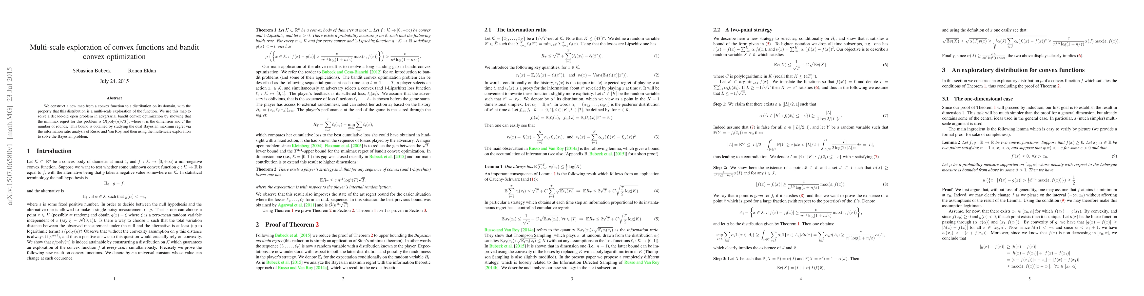 We construct a new map from a convex function to a distribution on its domain, with the property that this distribution is a multi-scale exploration of the function. We use this map to solve a decade-old open problem in adversarial bandit convex optimization by showing that the minimax regret for this problem is $\tilde{O}(\mathrm{poly}(n) \sqrt{T})$, where $n$ is the dimension and $T$ the number of rounds. This bound is obtained by studying the dual Bayesian maximin regret via the information ratio analysis of Russo and Van Roy, and then using the multi-scale exploration to solve the Bayesian problem.
