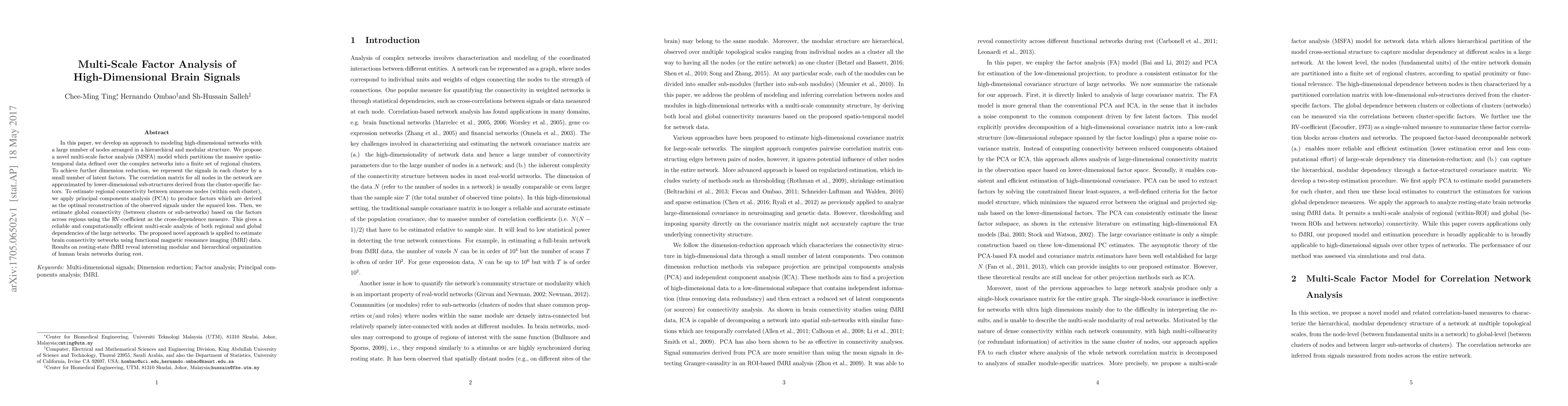 This paper introduces a multi-scale factor analysis (MSFA) model for high-dimensional brain signal networks, partitioning data into regional clusters and reducing dimensions via latent factors, while estimating connectivity using PCA and RV-coefficients. Applied to fMRI data, it reveals modular and hierarchical brain network organization during rest.
