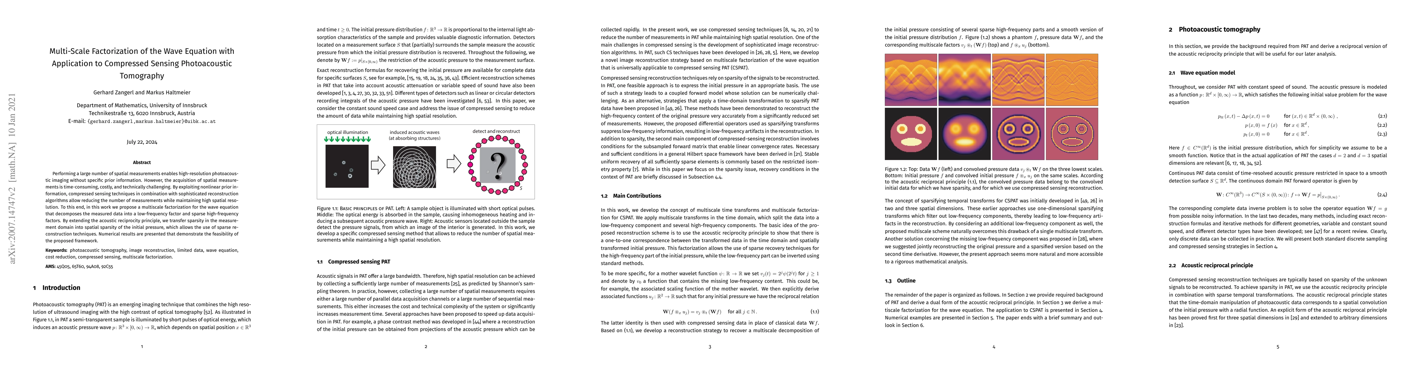 This paper proposes a multiscale factorization method for the wave equation to enhance compressed sensing in photoacoustic tomography, reducing the number of required spatial measurements while maintaining high resolution. The method leverages sparsity and the acoustic reciprocity principle to transform measurement sparsity into spatial sparsity of the initial pressure, enabling effective sparse reconstruction.
