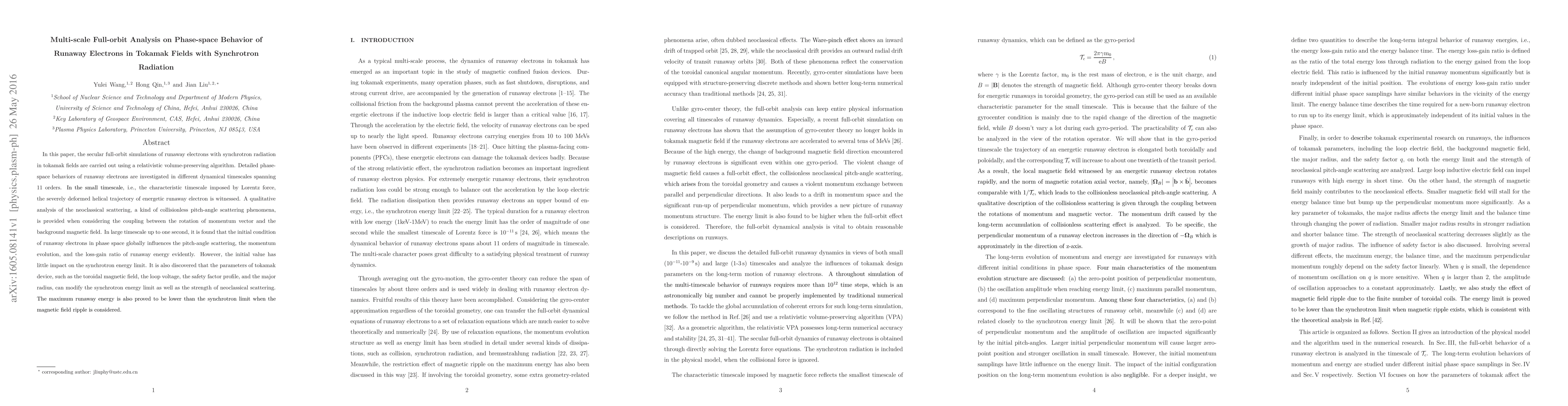 In this paper, the secular full-orbit simulations of runaway electrons with synchrotron radiation in tokamak fields are carried out using a relativistic volume-preserving algorithm. Detailed phase-space behaviors of runaway electrons are investigated in different dynamical timescales spanning 11 orders. When looking into the small timescale, i.e., the characteristic timescale imposed by Lorentz force, the severely deformed helical trajectory of energetic runaway electron is witnessed. A qualitative analysis of the neoclassical scattering, a kind of collisionless pitch-angle scattering phenomena, is provided when considering the coupling between the rotation of momentum vector and the background magnetic field. In large timescale up to one second, it is found that the initial condition of runaway electrons in phase space globally influences the pitch-angle scattering, the momentum evolution, and the loss-gain ratio of runaway energy evidently. However, the initial value has little impact on the synchrotron energy limit. It is also discovered that the parameters of tokamak device, such as the toroidal magnetic field, the loop voltage, the safety factor profile, and the major radius, can modify the synchrotron energy limit as well as the strength of neoclassical scattering. The maximum runaway energy is also proved to be lower than the synchrotron limit when the magnetic field ripple is considered.