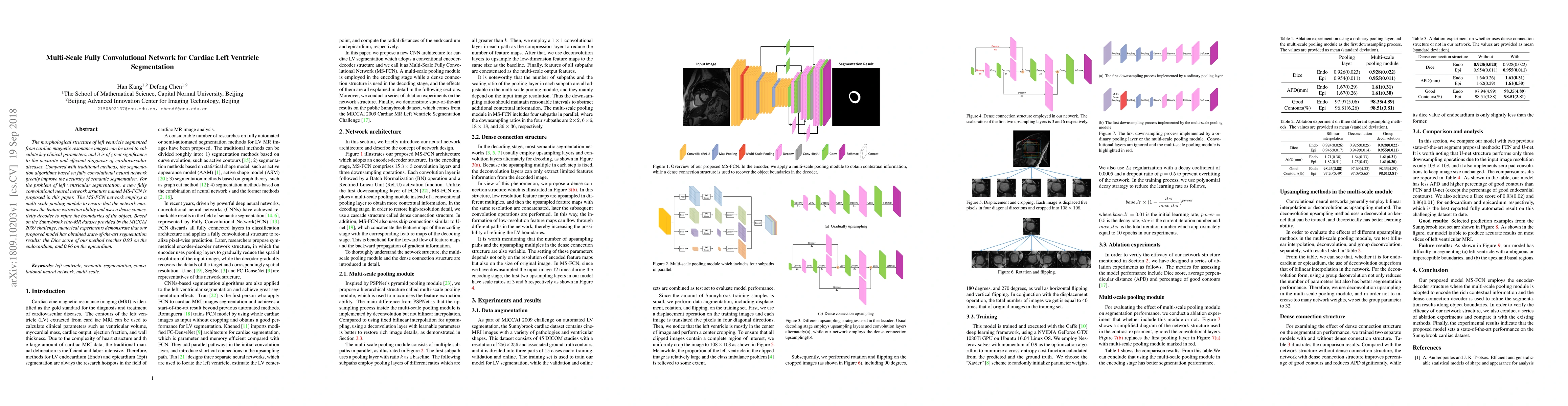 This paper proposes a Multi-Scale Fully Convolutional Network (MS-FCN) for cardiac left ventricle segmentation, utilizing a multi-scale pooling module in the encoding stage and a dense connectivity decoder in the decoding stage.