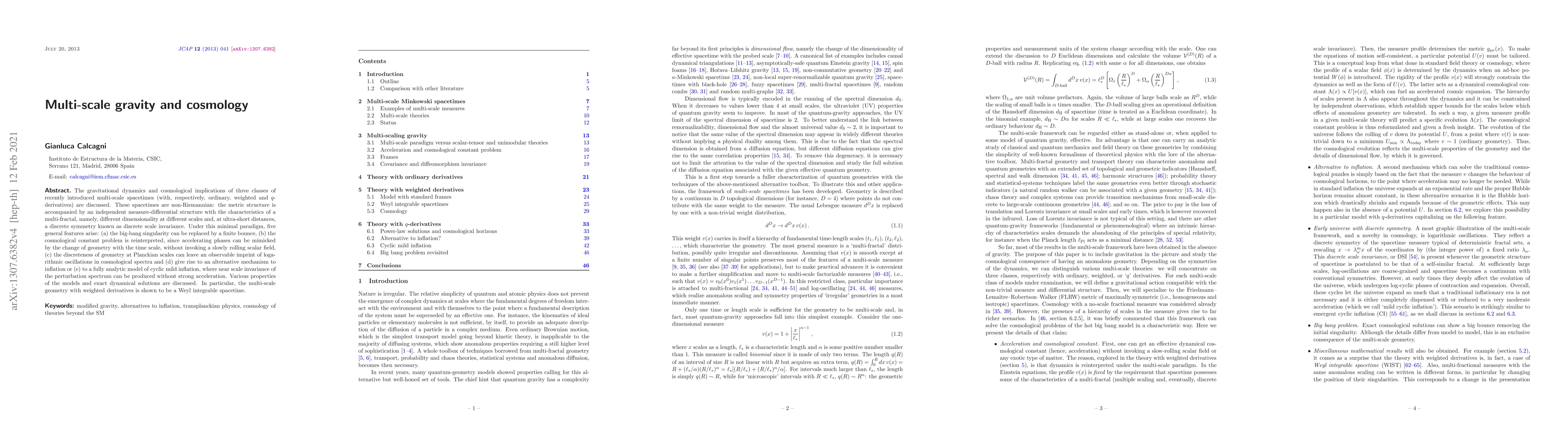 The gravitational dynamics and cosmological implications of three classes of recently introduced multi-scale spacetimes (with, respectively, ordinary, weighted and q-derivatives) are discussed. These spacetimes are non-Riemannian: the metric structure is accompanied by an independent measure-differential structure with the characteristics of a multi-fractal, namely, different dimensionality at different scales and, at ultra-short distances, a discrete symmetry known as discrete scale invariance. Under this minimal paradigm, five general features arise: (a) the big-bang singularity can be replaced by a finite bounce, (b) the cosmological constant problem is reinterpreted, since accelerating phases can be mimicked by the change of geometry with the time scale, without invoking a slowly rolling scalar field, (c) the discreteness of geometry at Planckian scales can leave an observable imprint of logarithmic oscillations in cosmological spectra and (d) give rise to an alternative mechanism to inflation or (e) to a fully analytic model of cyclic mild inflation, where near scale invariance of the perturbation spectrum can be produced without strong acceleration. Various properties of the models and exact dynamical solutions are discussed. In particular, the multi-scale geometry with weighted derivatives is shown to be a Weyl integrable spacetime.