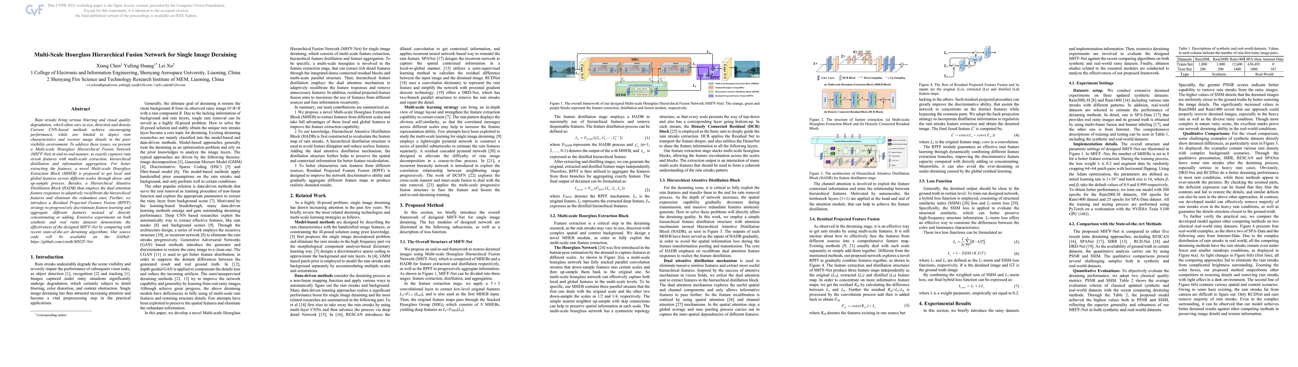 The paper proposes a Multi-Scale Hourglass Hierarchical Fusion Network (MH2F-Net) for single image deraining, utilizing multi-scale extraction and hierarchical distillation to capture rain streak features and recover image details. The network includes a Multi-scale Hourglass Extraction Block for feature extraction and a Hierarchical Attentive Distillation Block for adaptive feature recalibration, demonstrating superior performance compared to recent state-of-the-art methods.