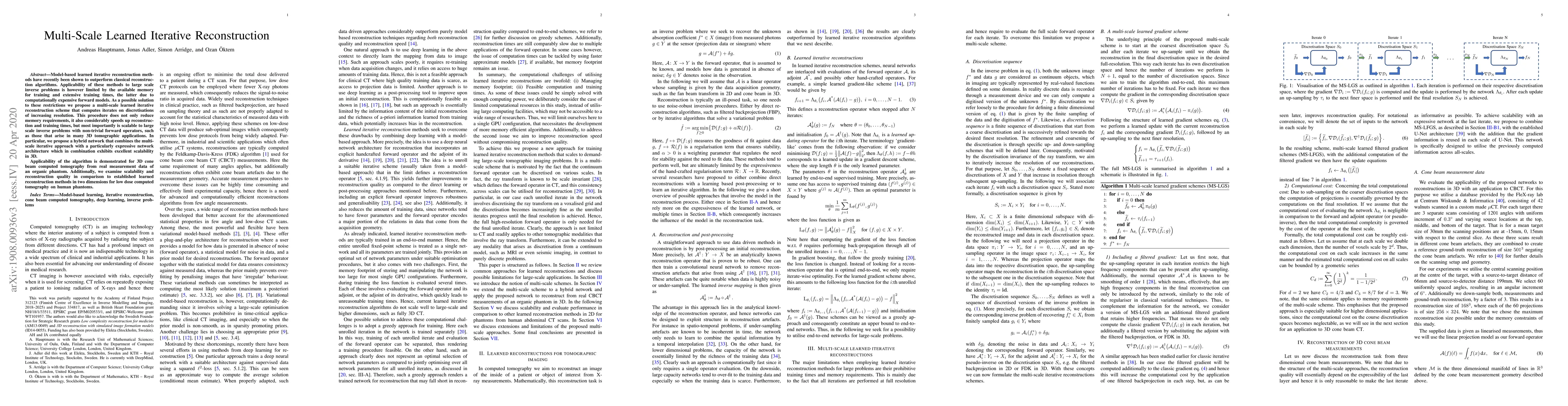This paper proposes a multi-scale learned iterative reconstruction method to address memory and training time limitations in large scale inverse problems, demonstrating improved scalability and reconstruction quality in 3D cone beam computed tomography and low dose computed tomography applications. The hybrid network approach significantly speeds up reconstruction and training.